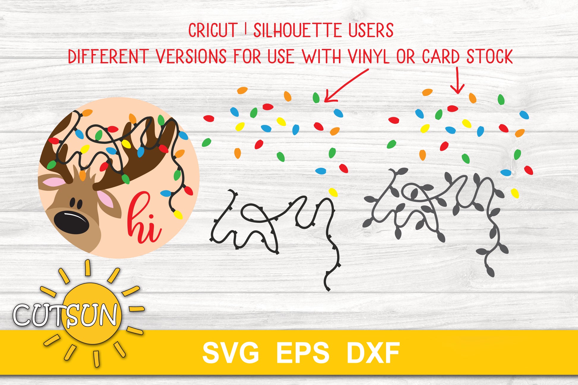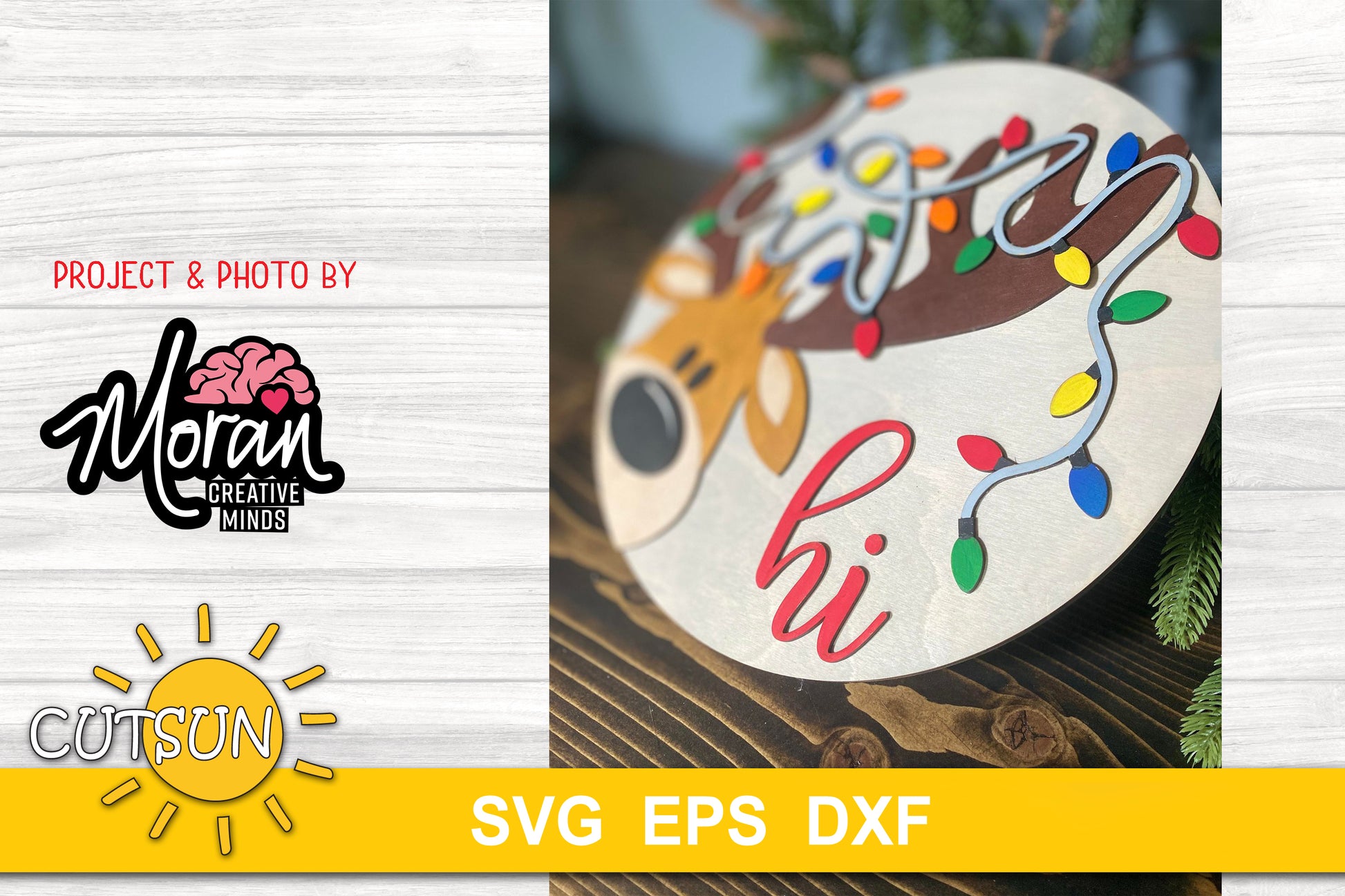 Digital download for a Round Christmas sign with a Reindeer and Christmas lights and the word Hi - suitable to be used with Glowforge | laser cutters, but also with Cricut and Silhouette craft cutting machines.
