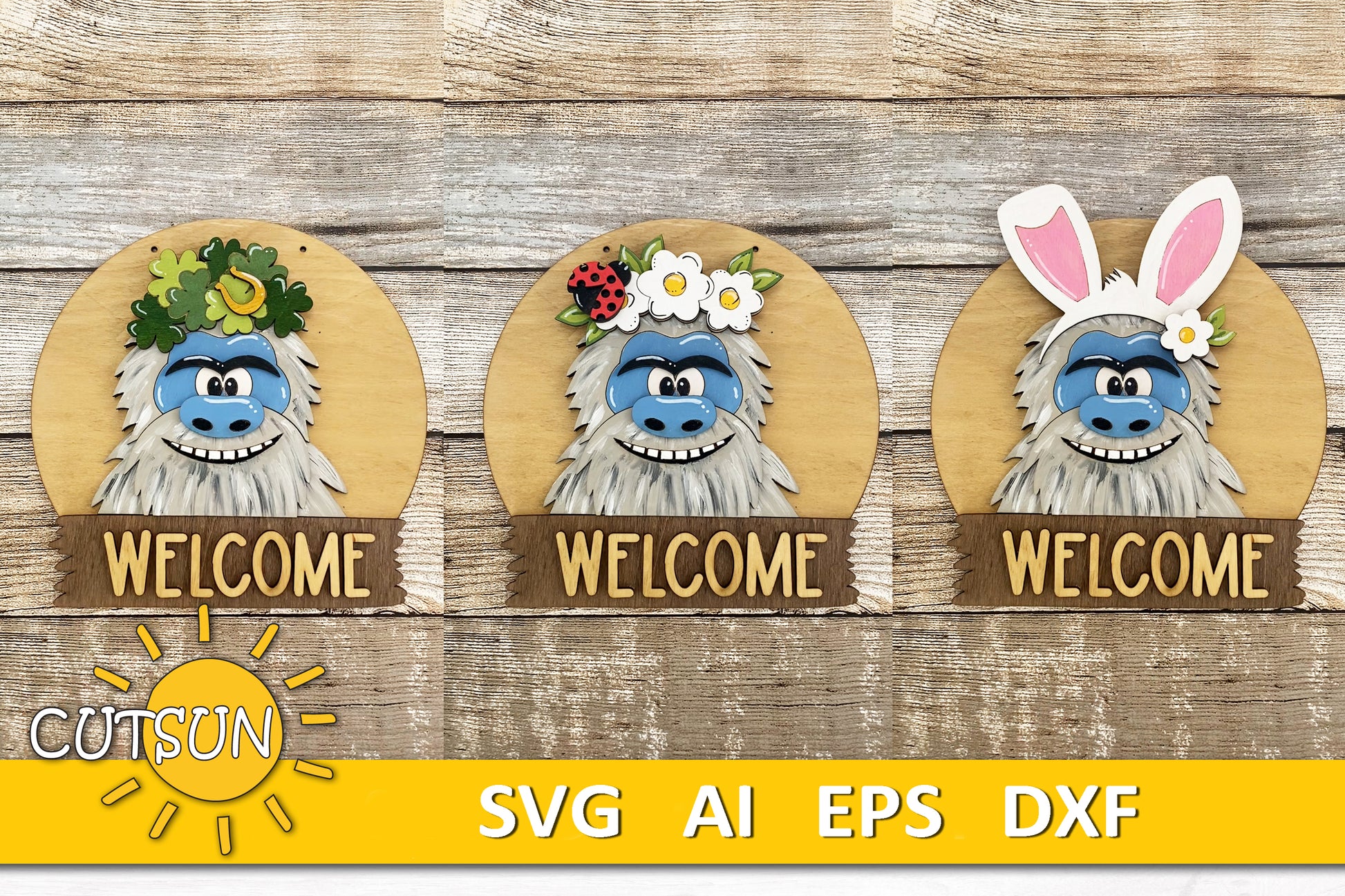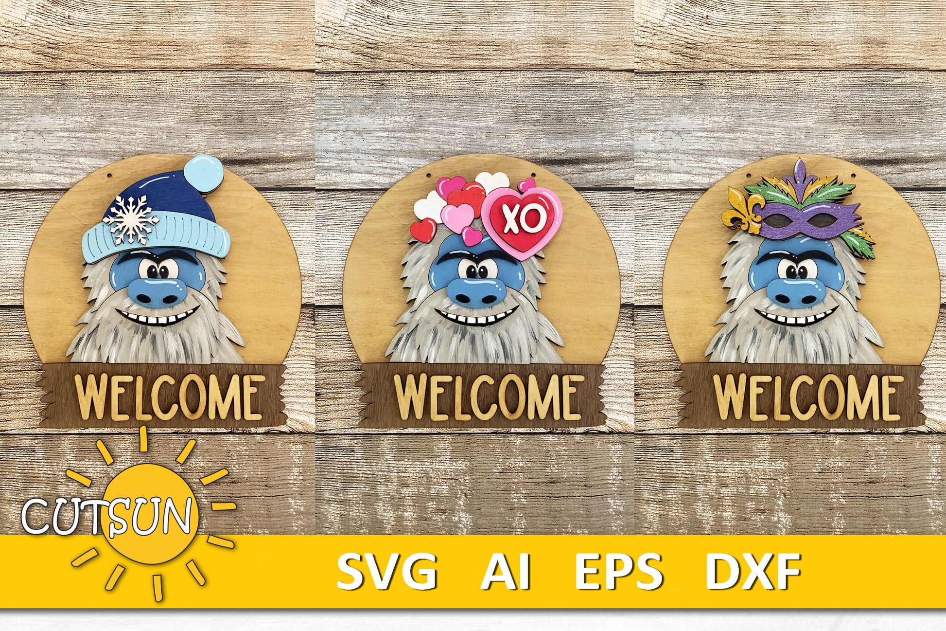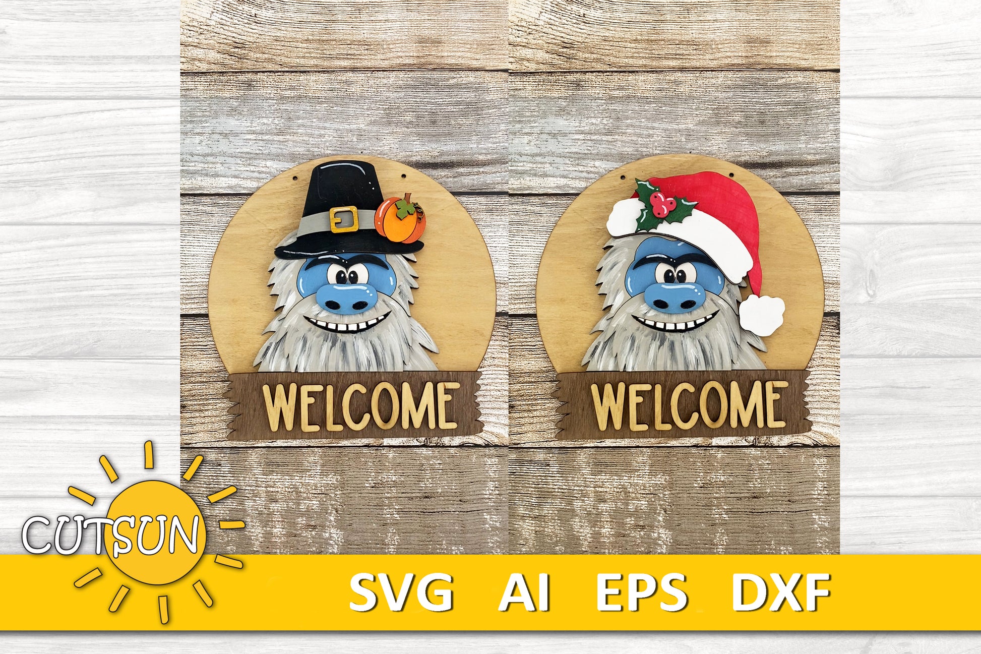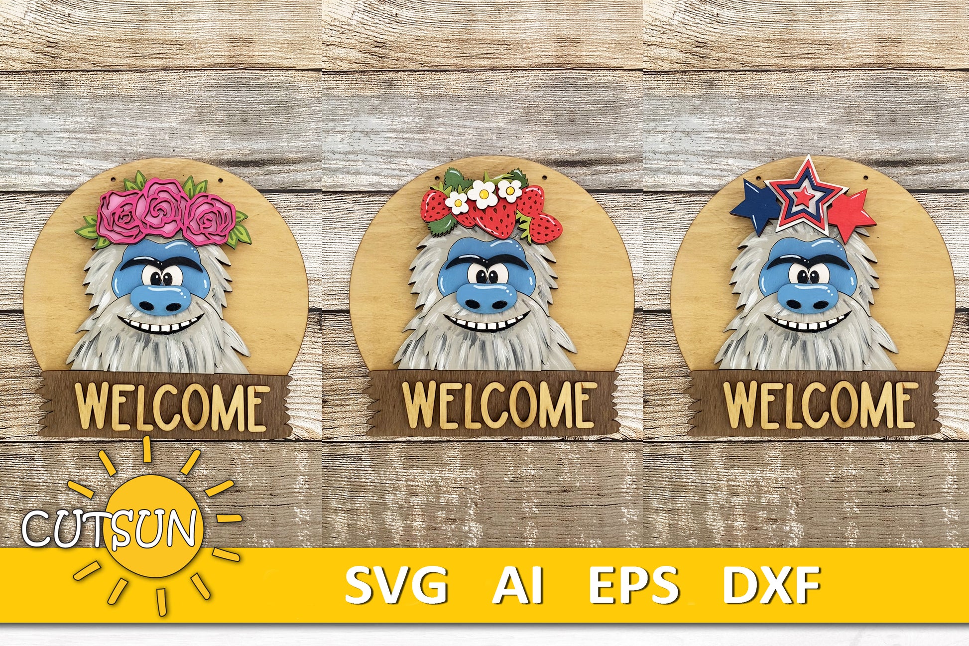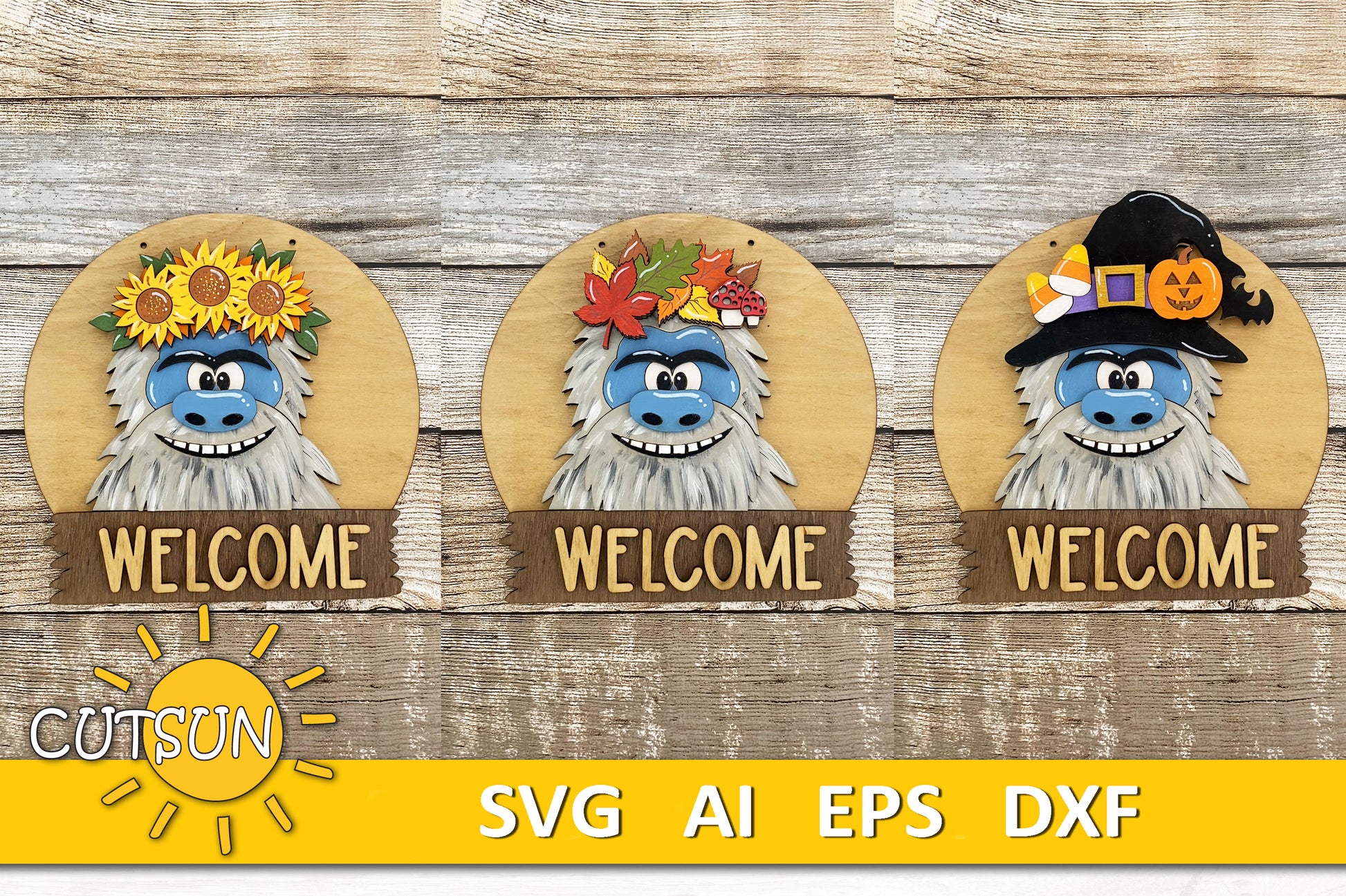 Introducing our Big foot / Sasquatch / Yeti door hanger SVG - an interchangeable round sign that can be used with or without the seasonal add-ons! Please check the preview images of this welcome sign svg and contact me if you need more information.