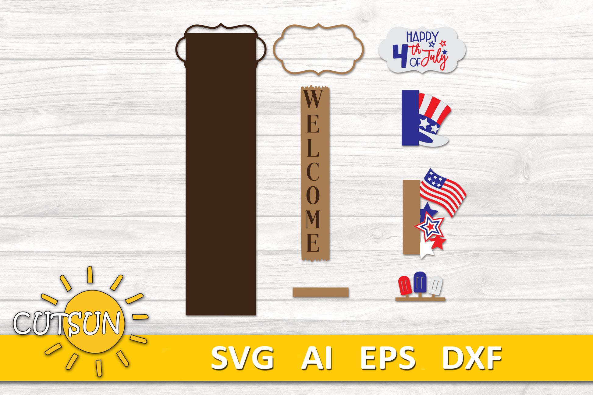 4th of July Porch Sign SVG | Interchangeable Patriotic Hat Add-On | Vertical Porch Leaner Welcome Sign | Independence Day Laser Cut File