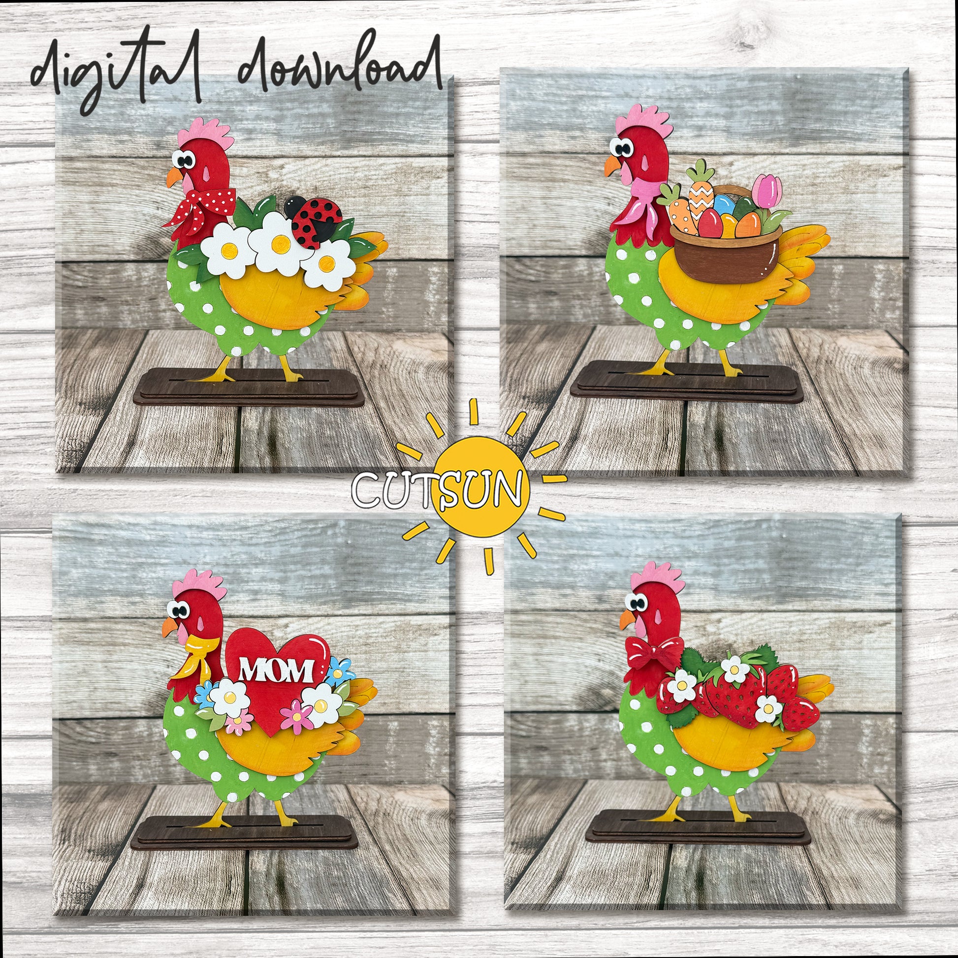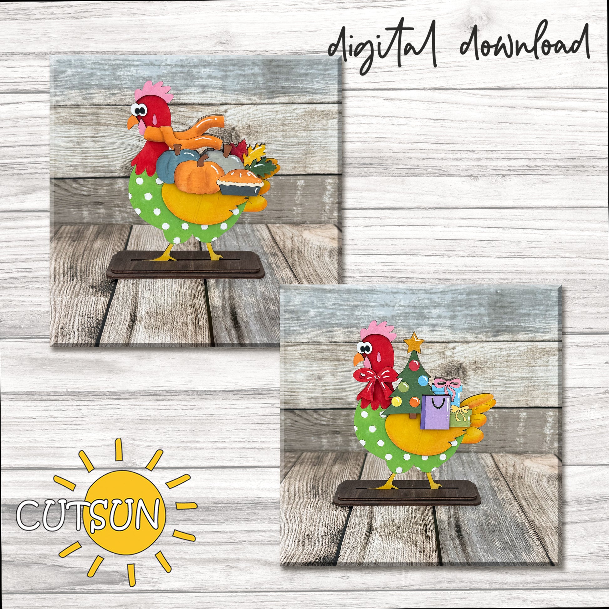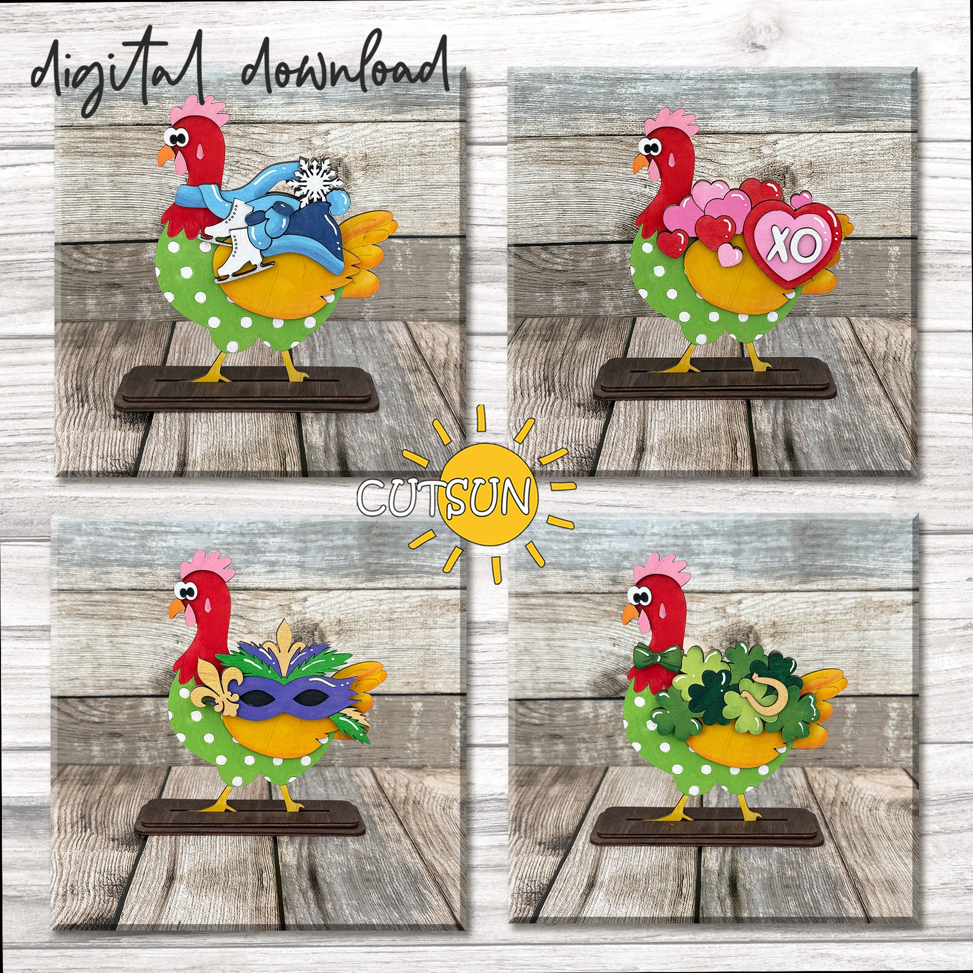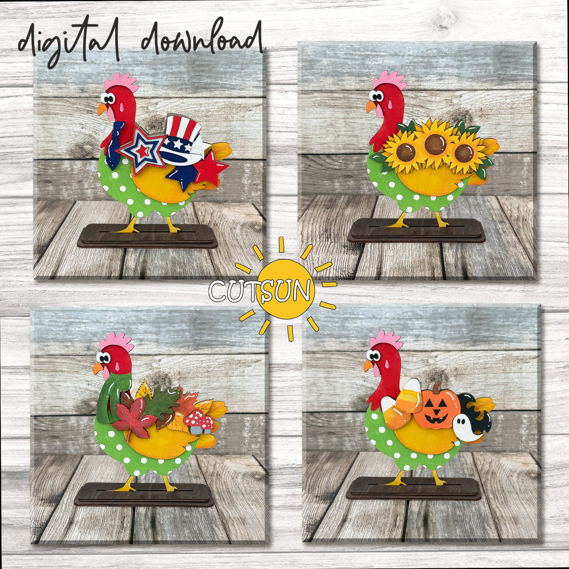 Chicken Shelf Sitter SVG Bundle | Base File + 14 Seasonal Add-Ons | Laser Cut Files for Farmhouse Shelf Decor