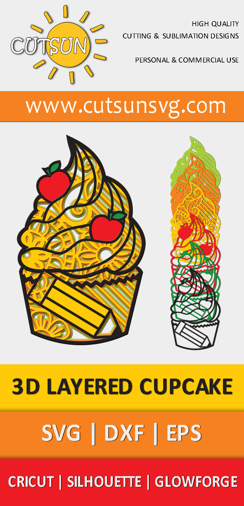 3D Layered Cupcake SVG cut file 5 layers - Layered image of a Cupcake decorated with a pencil and apples, a great item for Back to school, Teacher's appreciation week and other school related events