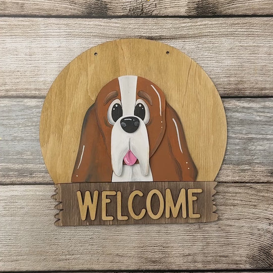 Create adorable pet-themed porch decor with this Basset Hound dog door hanger SVG. This round interchangeable sign base features a sweet basset hound face and a welcome-style plaque, designed to be used as a stand-alone door sign or as the foundation for seasonal and holiday add-ons.