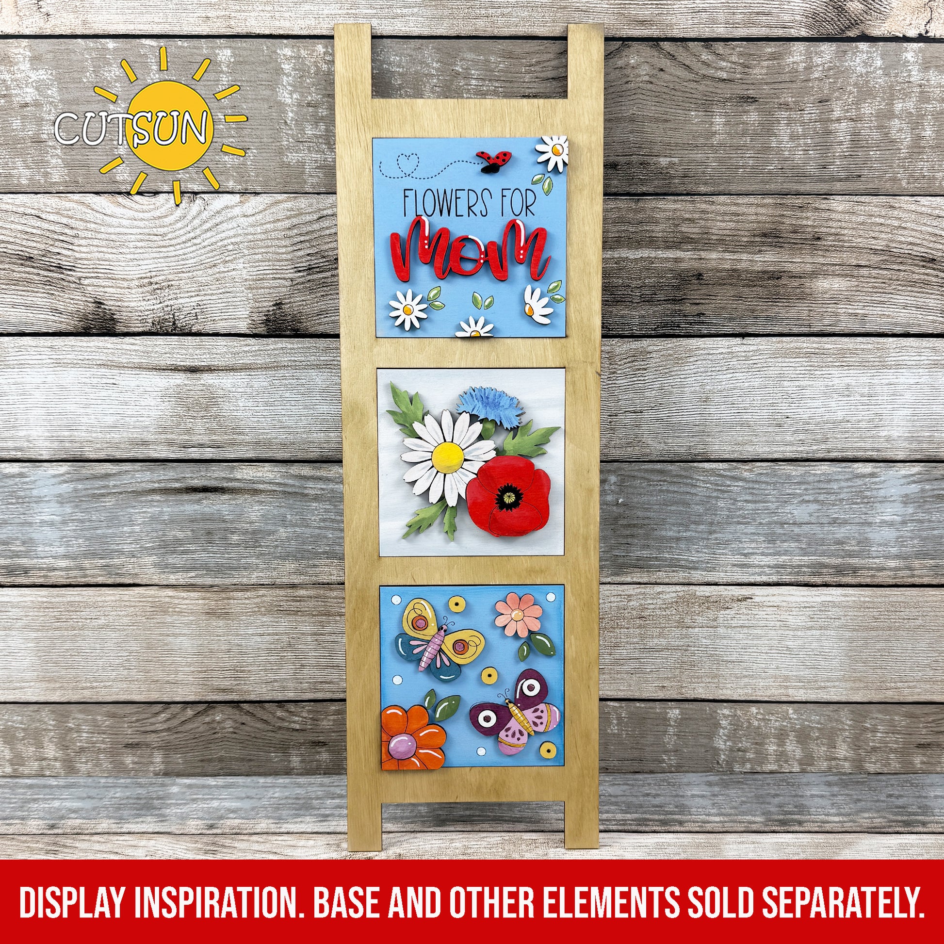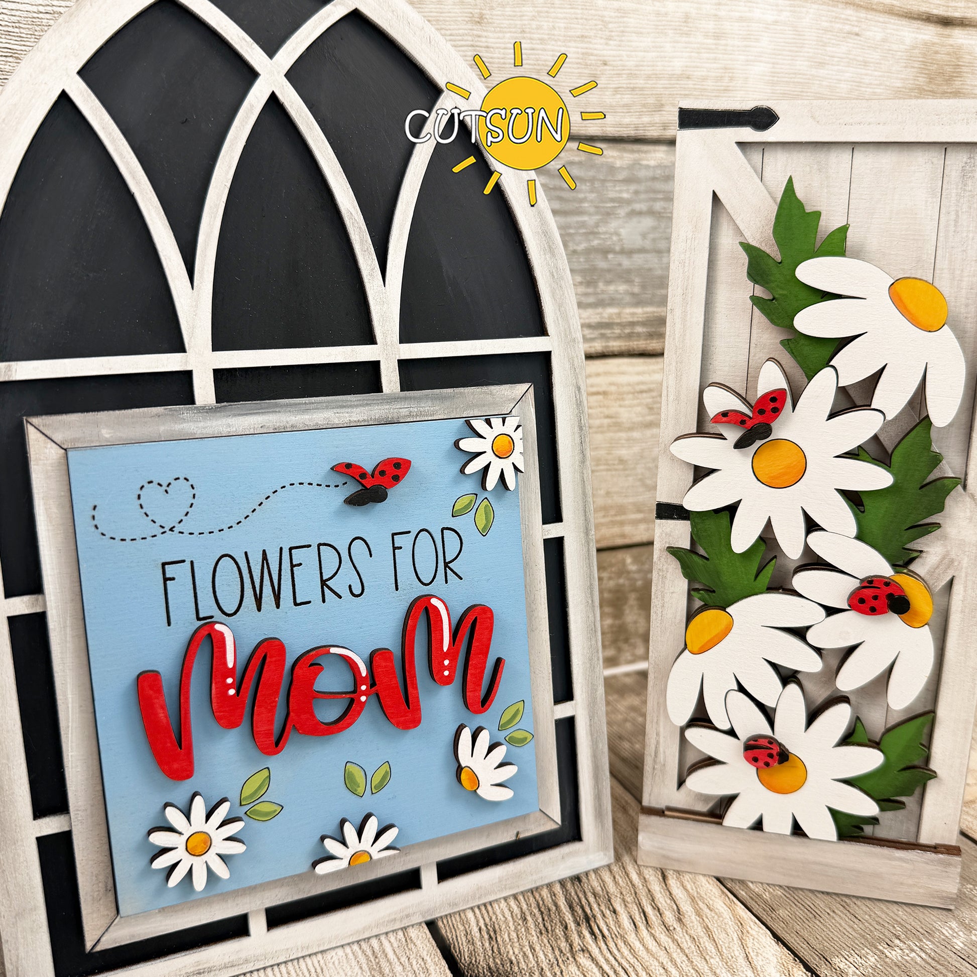 Create a dimensional Mother’s Day display with this Flowers for Mom Farmhouse Window Add-On SVG, designed specifically for laser cutters and interchangeable decor systems. This layered digital file transforms your Interchangeable Farmhouse Window base into a cheerful floral statement featuring bold daisies, layered greenery, sweet ladybug accents, and a square “Flowers for Mom (Mum)” centerpiece.