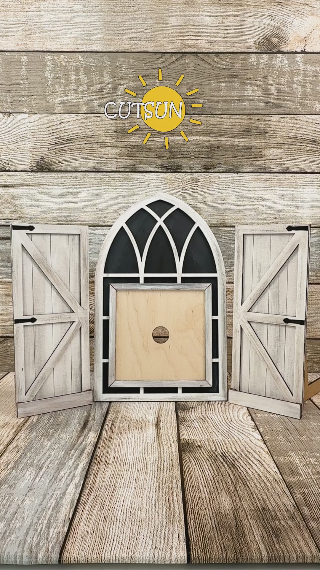The shutter panels are built with multiple layers to give depth and visual interest once cut and painted. The coordinating square insert fits inside the window opening, allowing you to refresh your display seasonally while keeping the same base structure. This makes it ideal for building a cohesive interchangeable decor collection that evolves throughout the year.