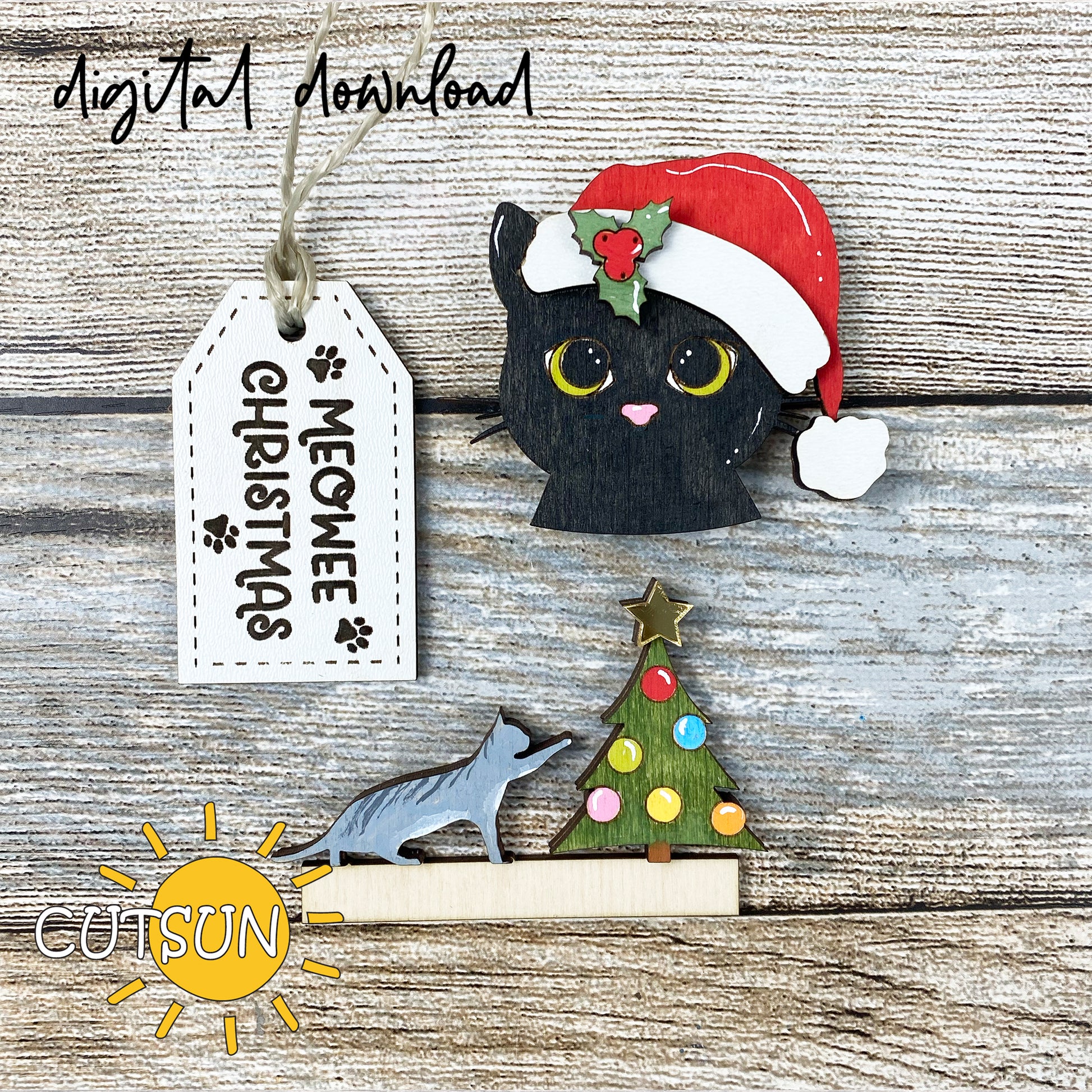 Introducing our digital download for an interchangeable Cutting board decor with a whimsical Christmas cat / kitten add-on. The laser cut file features a cute cat wearing a Santa's hat decorated with a small holly berry, a cat trying to touch the Christmas tree and a tag with the words Meowee Christmas and a paw print. The SVG is suitable for use with Glowforge, Muse, Xtool and other laser cutters.