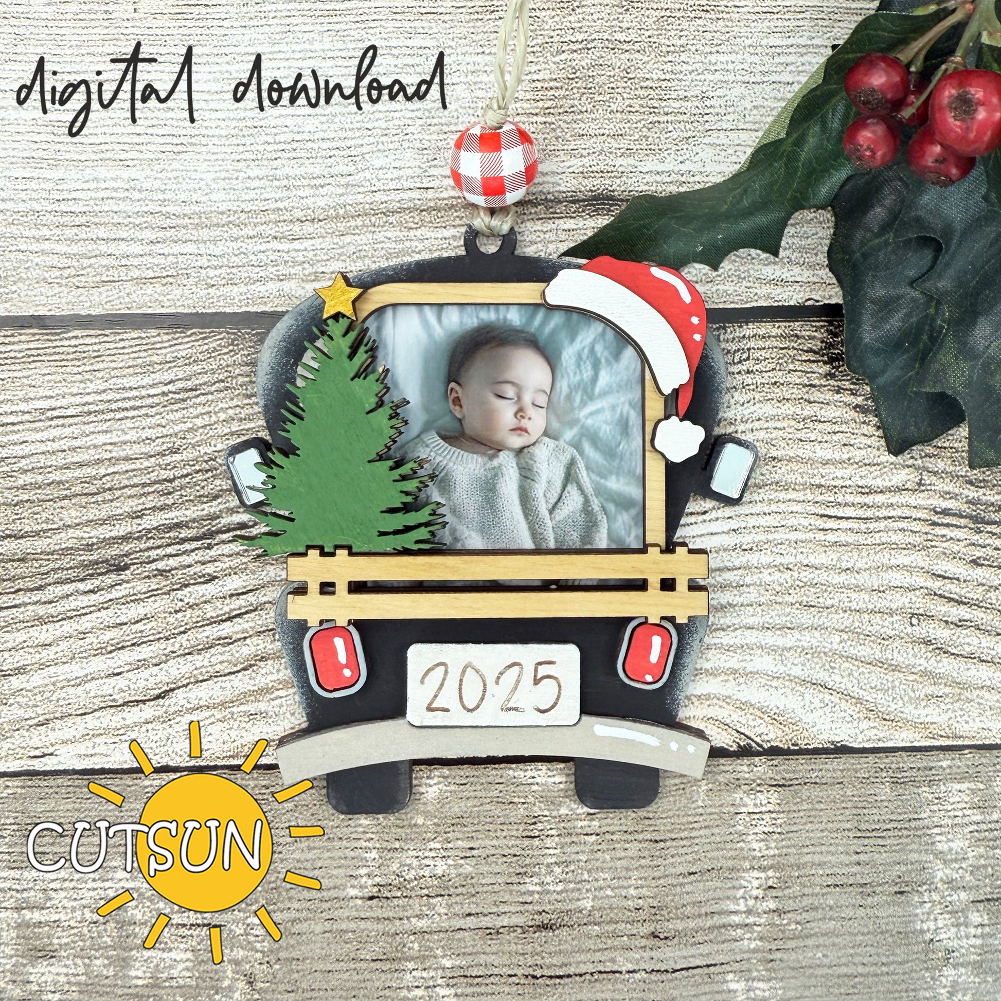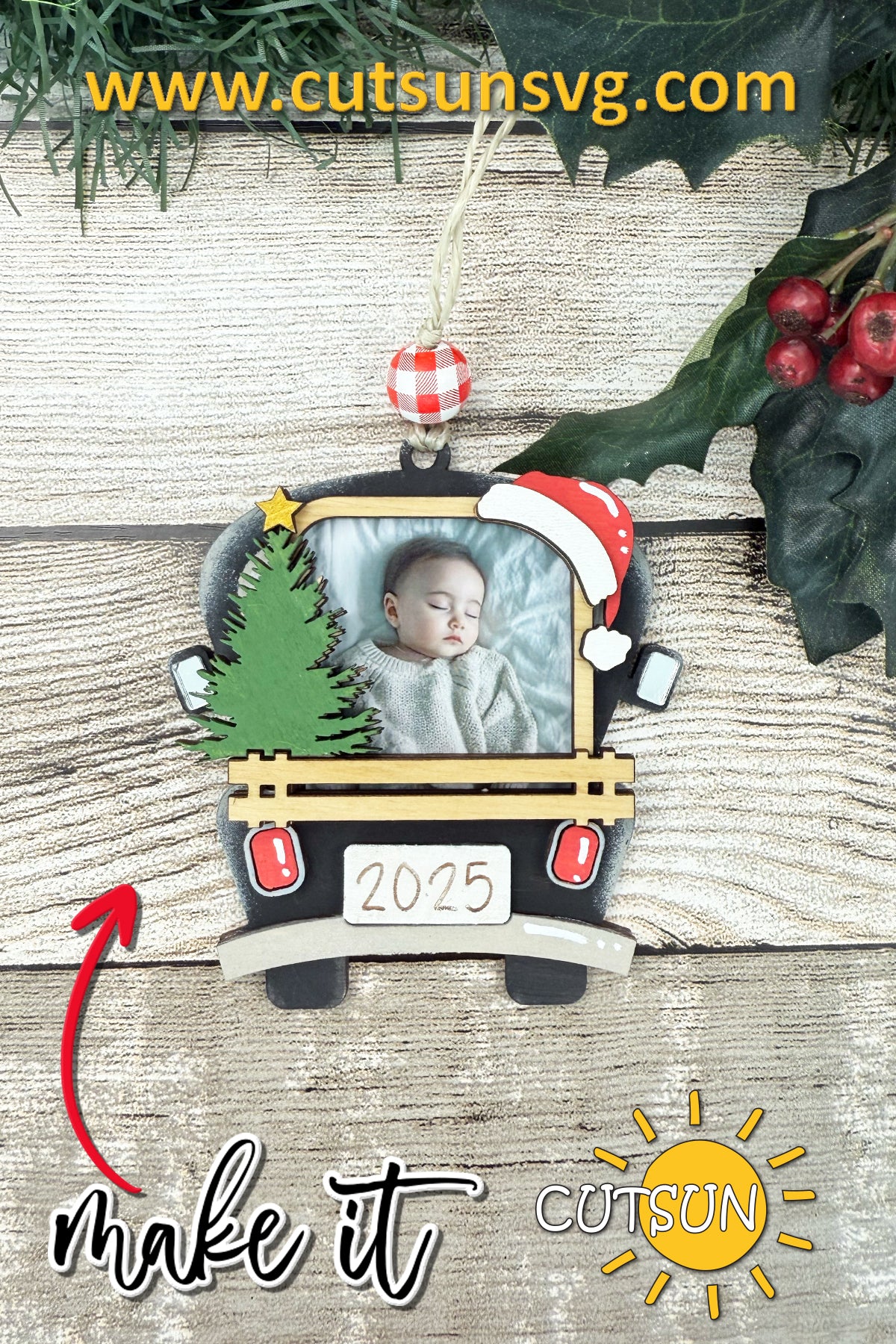 This ornament is shaped like a vintage truck with a layered 3D look, carrying a Christmas tree and topped with a Santa hat. The design includes a space for a personal photo, making it ideal for memory-making, personalized gifts, or selling finished pieces in your shop.