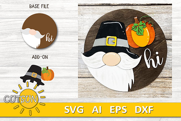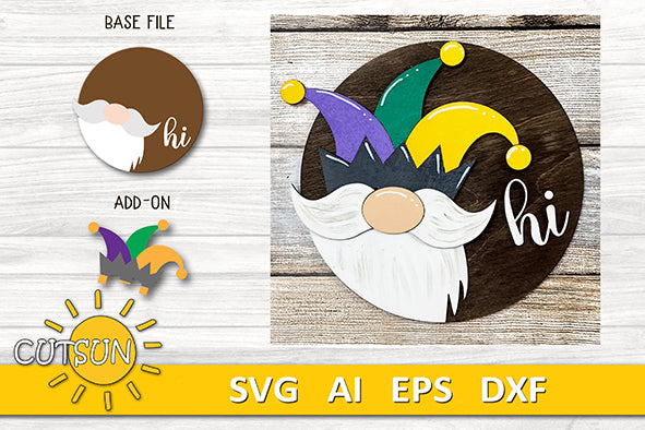 The base file for the round welcome sign svg is included in the cut files set and is FREE OF CHARGE. It contains the Gnome's beard, nose and moustaches, and can be used with other add-ons for the same round base file. Just ensure that the add-ons are cut to fit your desired round size and material thickness. The files are saved for a 12" diameter back piece, but can be easily resized. Use this set for a door or home decor, and you can even downsize it - we tested successfully at a 7" diameter. Any other add-ons for the same gnome sign are compatible with the round, and will only require a future cut.