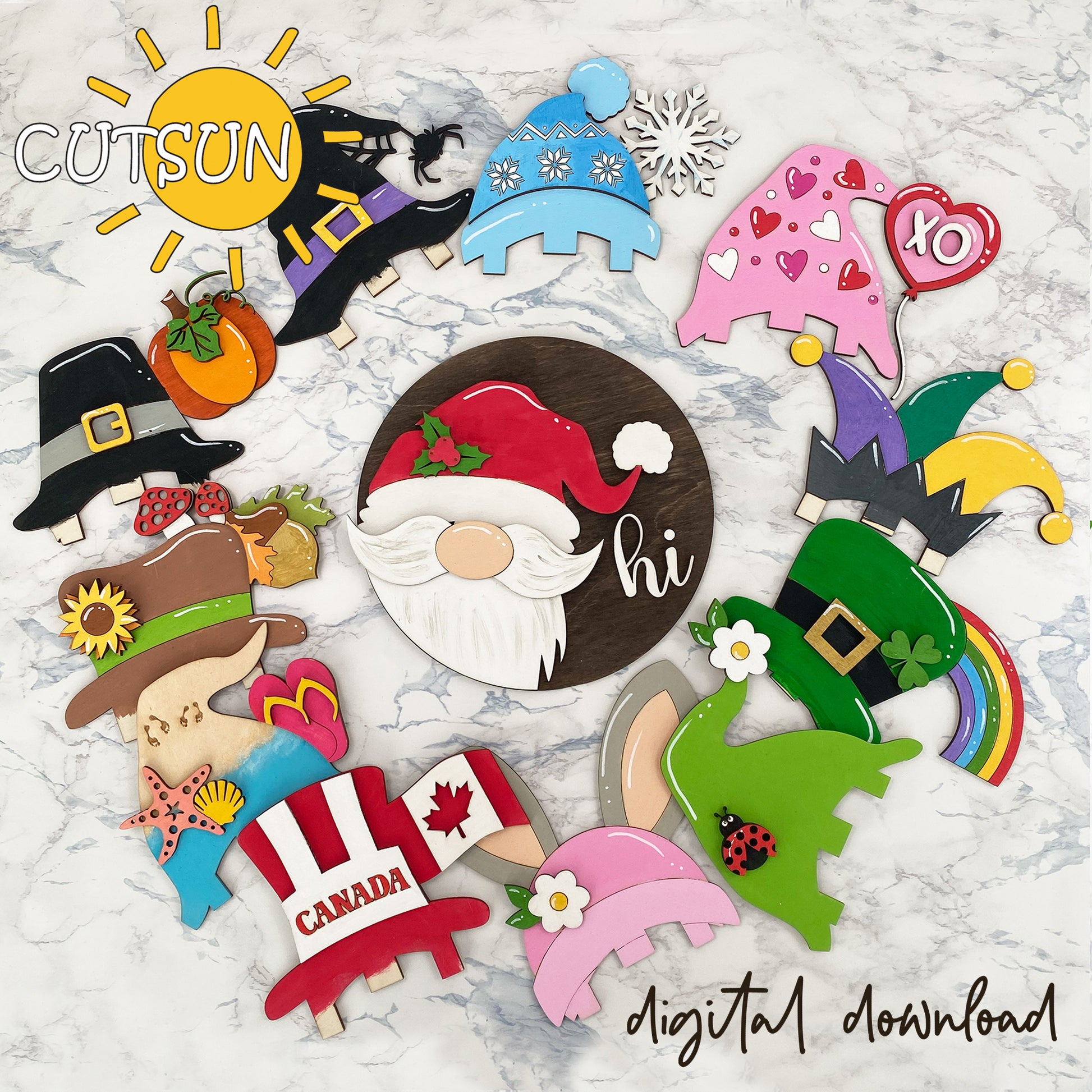 Introducing our digital download for an interchangeable Round Gnome door hanger svg Bundle - the Canadian version. The base file comes with 12 seasonal add-ons, including a back round and the beard, moustache, and nose of a gnome. Use the add-ons to switch between 12 different hats, such as a festive Santa hat for Christmas, a charming hat adorned with hearts and a heart balloon for Valentine's Day, and a playful Jester hat for Mardi Gras. Other options include a green hat with a rainbow for St. Patrick's Day, a cute hat with a flower instead of a pom pom and a lady bug for the Spring, and bunny ears for Easter. For summer, choose from sand, waves, footprints, and a starfish and sea shell, or celebrate Canada day. As the seasons change, you can switch it up with a hat featuring a sunflower, mushrooms, and fall leaves for the Fall, a pilgrim hat with a pumpkin for Thanksgiving; and a Witch hat with a spider and spider web for Halloween.