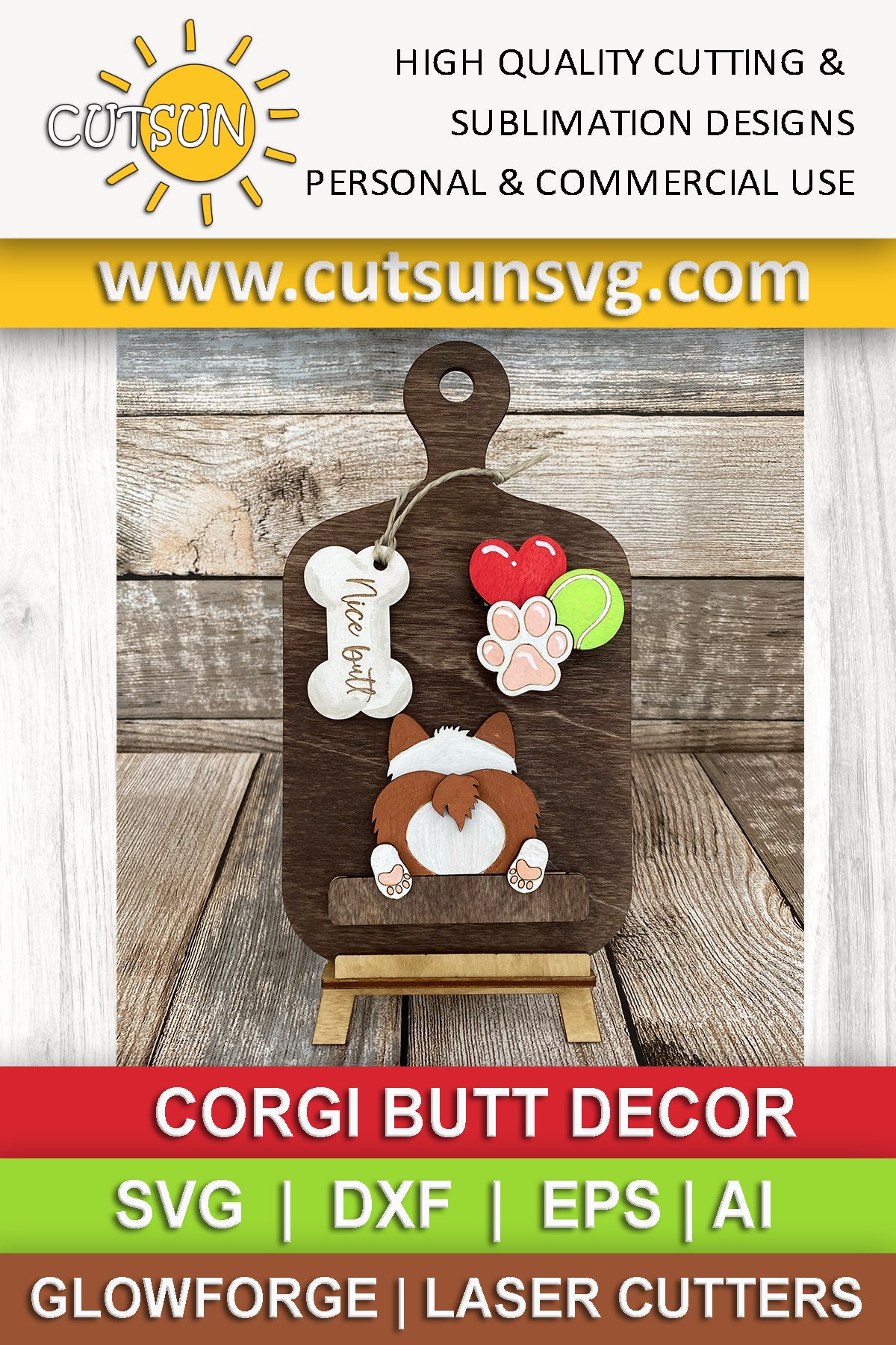 Introducing our digital download for an interchangeable Cutting board decor with a Corgi butt add-on. The laser cut file features the adorable butt of a corgi, a heart, tennis ball and a paw and a bone-shaped tag with the words Nice butt. The SVG is suitable for use with Glowforge, Muse, Xtool and other laser cutters.