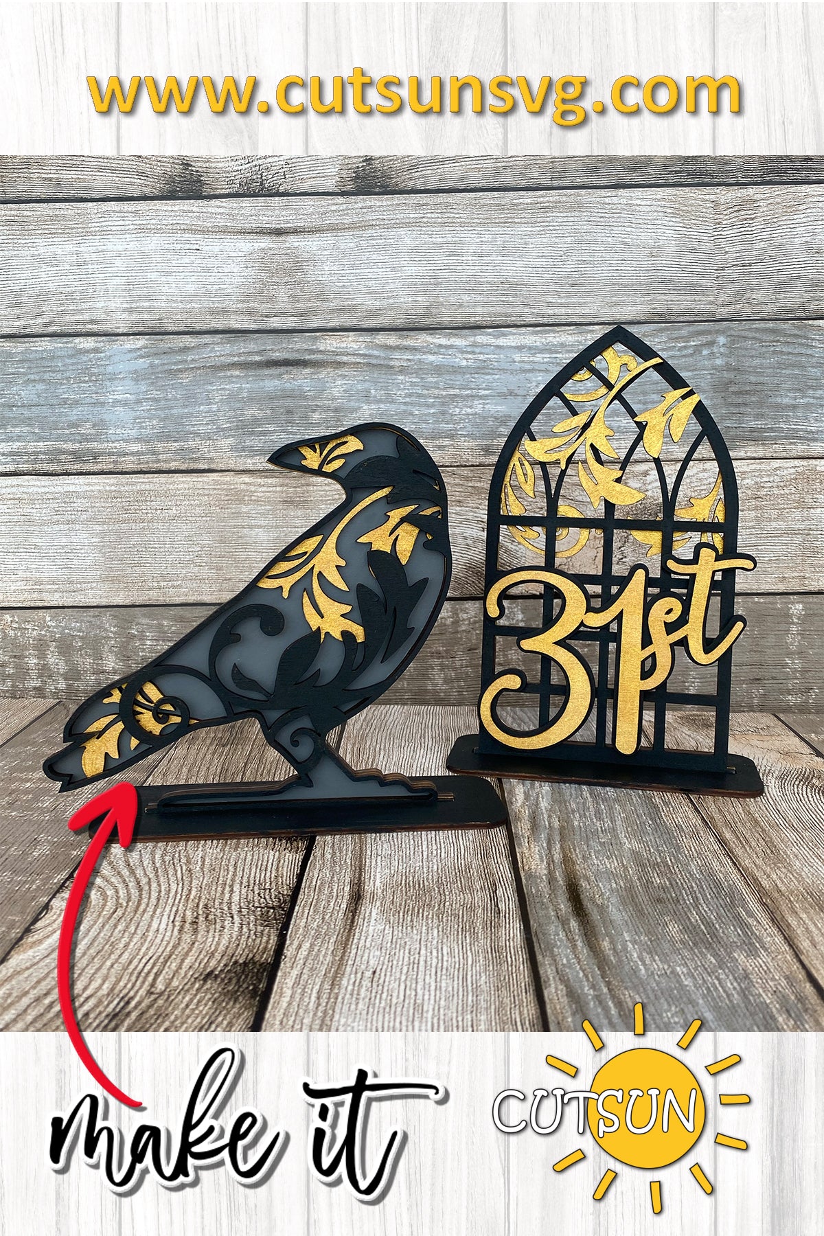 This is a digital download featuring a bundle of two standing decorations - an ornate crow and window with scrolls and the number 31st. The svg files are suitable for use with Glowforge, Xtool, Muse or other laser cutters.