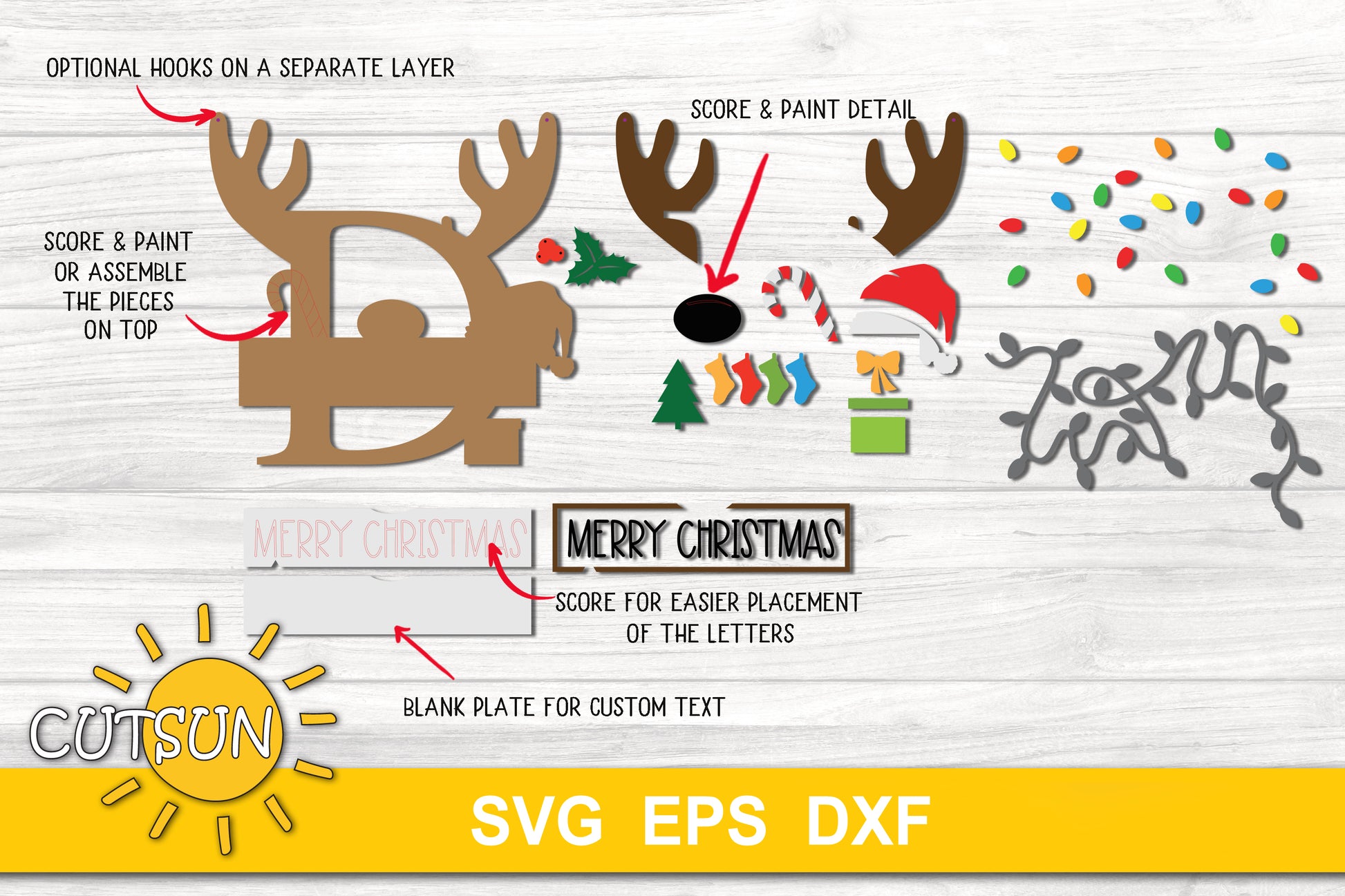 Cut file for a door hanger with the letter D, suitable to be used with Glowforge or other laser cutters. The file is featuring Christmas lights, Santa's hat, a present, a Christmas tree, stockings, a holly and a candy cane. You can use the file as is or you can add your Family name on the plate instead of Merry Christmas. Please read the details below.