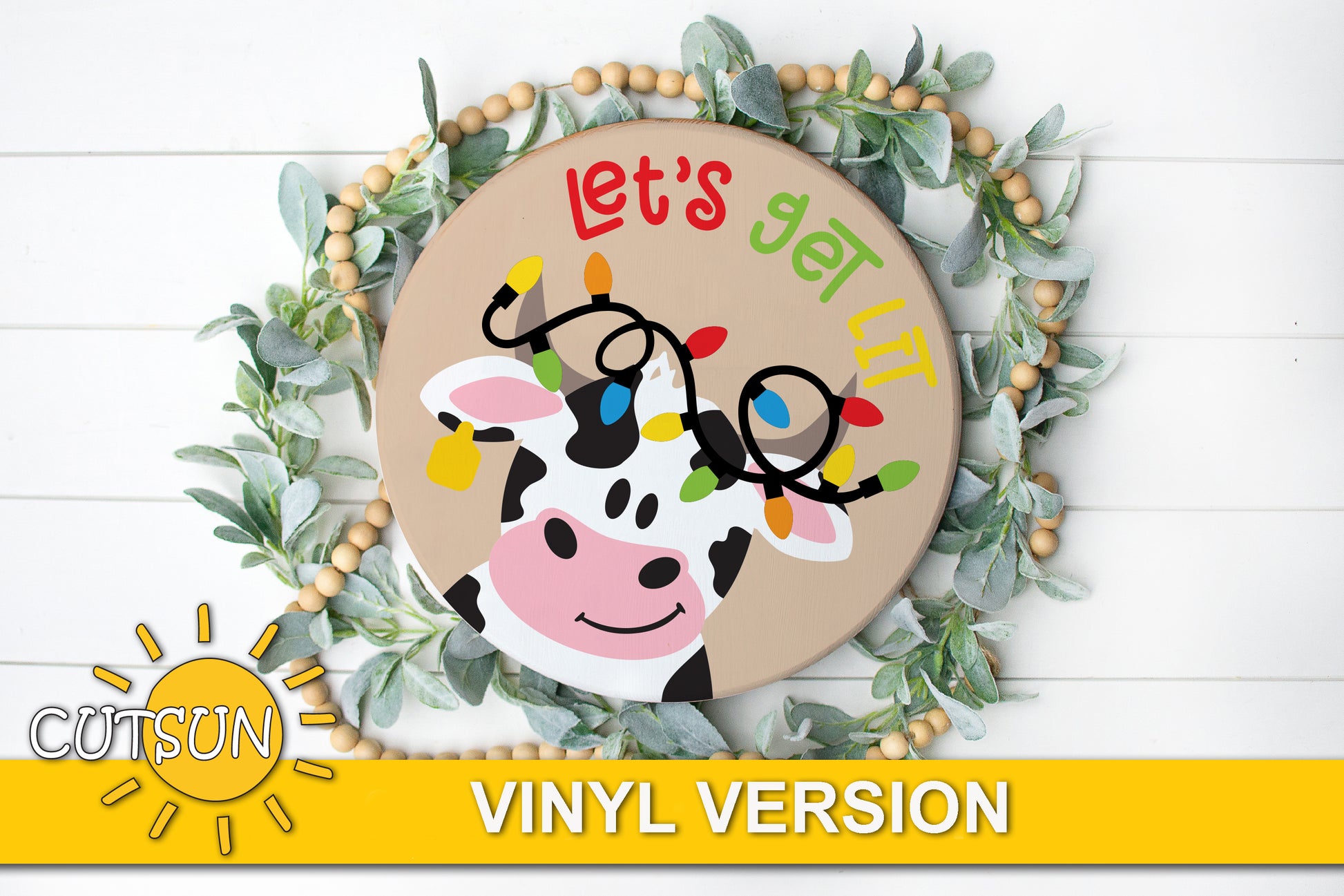 Spread holiday cheer to your front door with this charming dairy cow door hanger! This delightful SVG showcases a playful dairy cow peering from the side, adorned with a strand of Christmas lights atop its head, and the cheerful phrase "Let's Get Lit" in a whimsical font. It's the ideal addition for a cheerful and festive entryway.