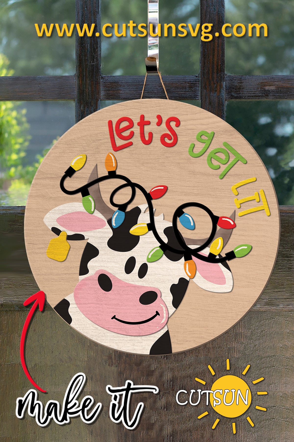 Christmas Cow Door Hanger SVG | Dairy Cow with Christmas Lights Welcome Sign | “Let’s Get Lit” Laser Cut File
