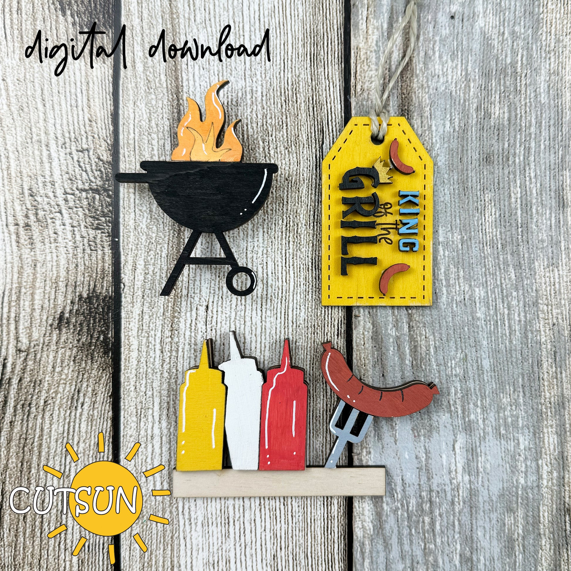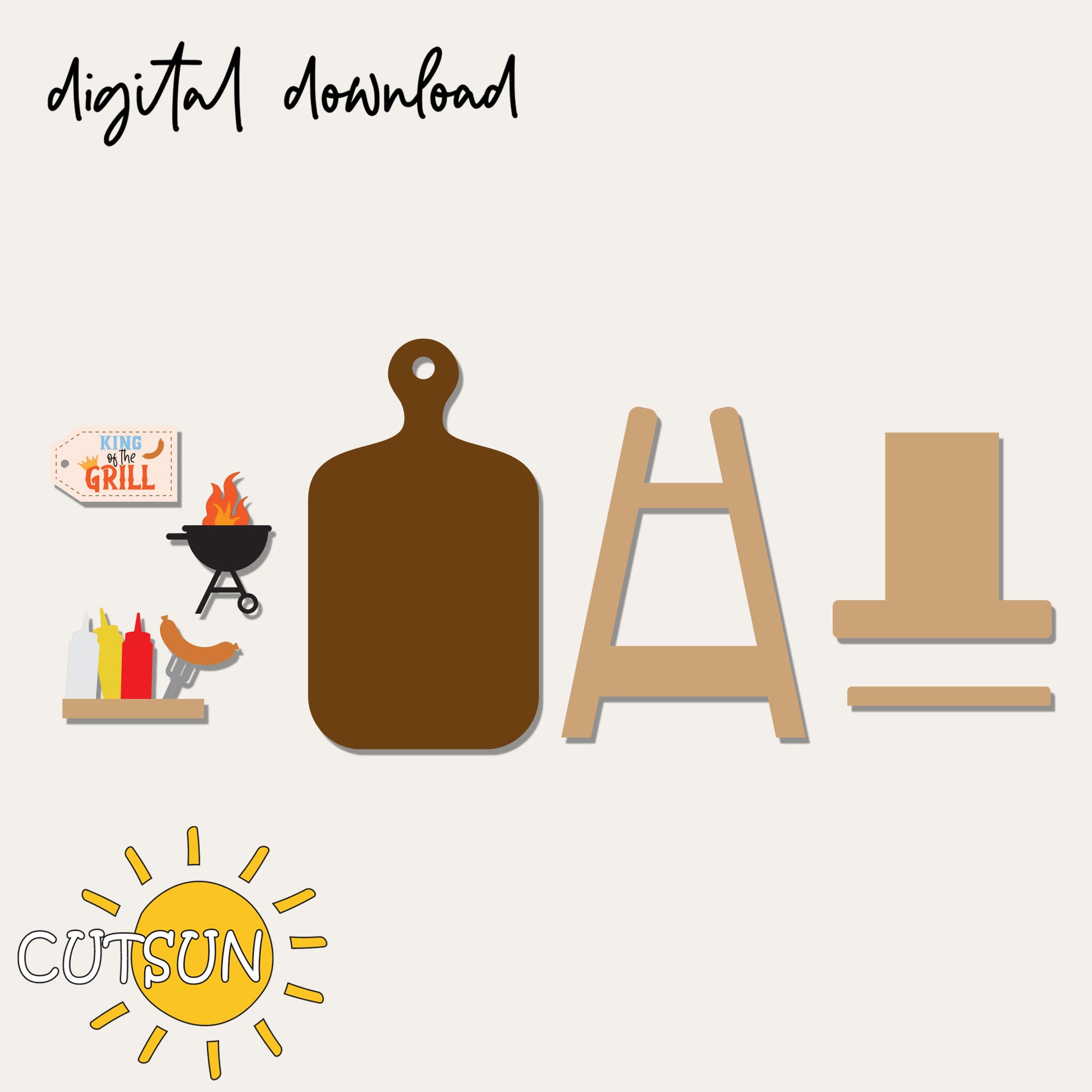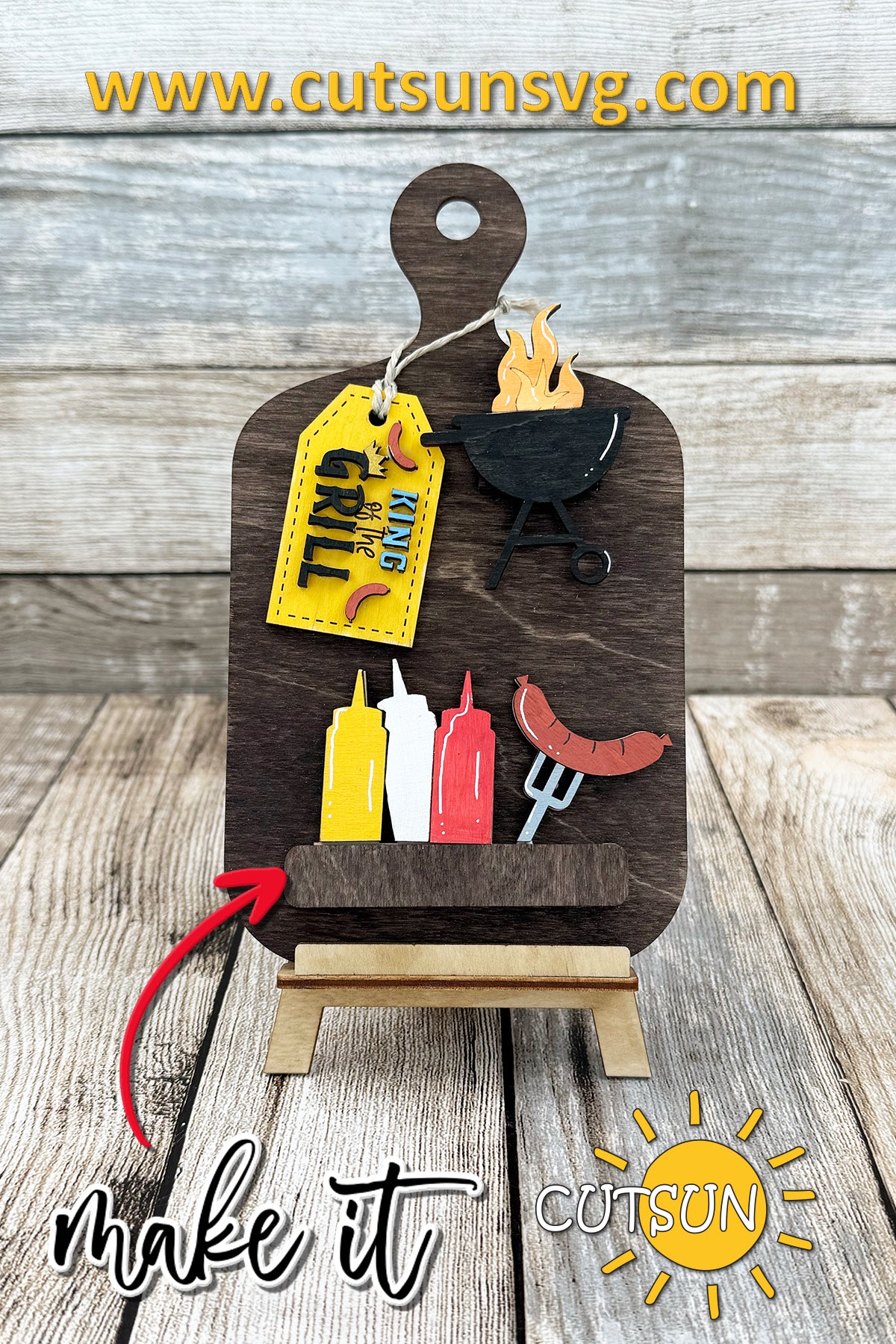 Introducing our digital download for an interchangeable cutting board décor with a King of the Grill add-on! This laser-cut file includes a small barbecue, squeeze bottles for ketchup, mayonnaise and mustard, a fork with a sausage, and a tag with the text "King of the Grill" a The SVG is suitable for use with Glowforge, Muse, Xtool and other laser cutters.