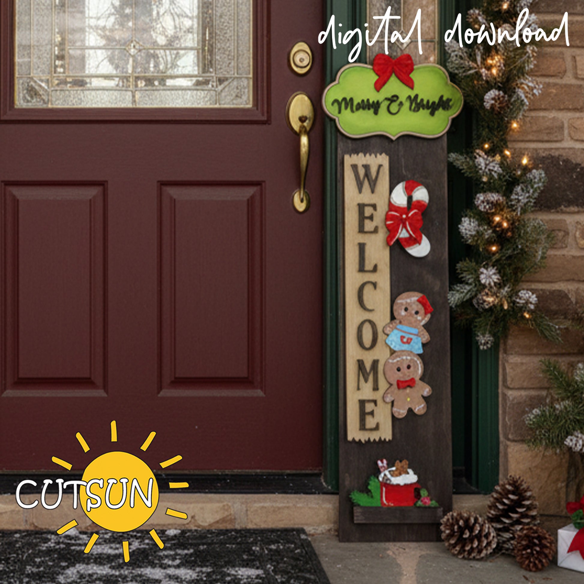 This layered Gingerbread Vertical Sign Add-On SVG brings a sweet and festive touch to your Christmas decorating projects. Designed for laser cutting, this digital file includes gingerbread cookies, a candy cane with a bow, a holiday gift box and a “Merry & Bright” plaque. Each piece is separated into clean layers, making it easy to cut from plywood or MDF and paint in your preferred holiday colors.