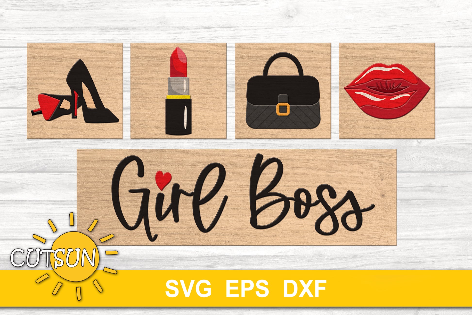 Girl Boss Leaning Sign SVG Bundle – Feminine Empowerment Designs with Heels, Lipstick, Purse & Lips for Interchangeable Backers | Laser Cut File