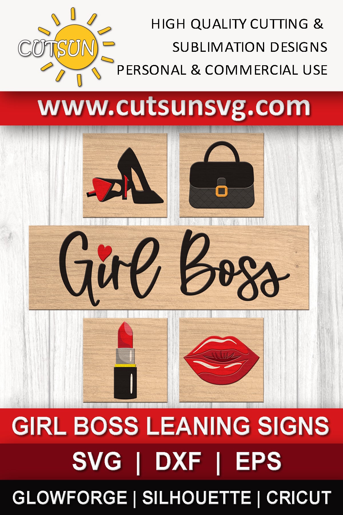 This SVG bundle includes five "Girl Boss" leaning sign designs featuring high heels, lipstick, a purse, and lips. These designs are perfect for adding a touch of feminine empowerment to your workspace or home office. Ideal for use with laser cutting machines or with Cricut | Silhouette craft cutting machines (version optimised for use with vinyl available), these designs are easy to customise and come in a high-quality file format. Use them to create motivational signs, wall art, or any other craft project that celebrates the power of women in business. These designs are sure to make a statement and inspire those around you. Show off your girl boss status with this versatile and stylish SVG bundle.