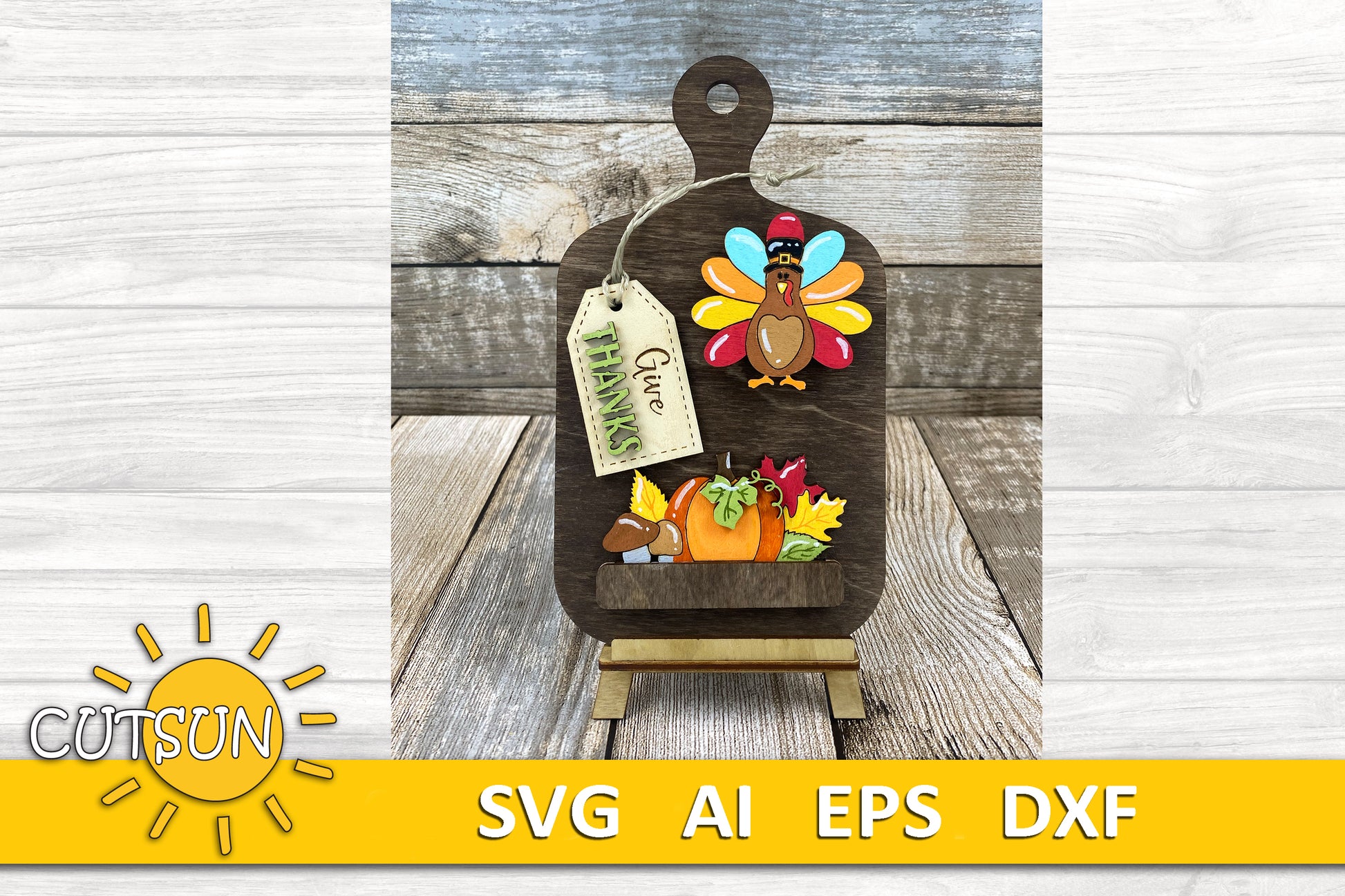 Give Thanks Interchangeable Cutting Board Decor SVG | Thanksgiving Shelf Decor Laser Cut File with Turkey, Pumpkin and Fall Leaves