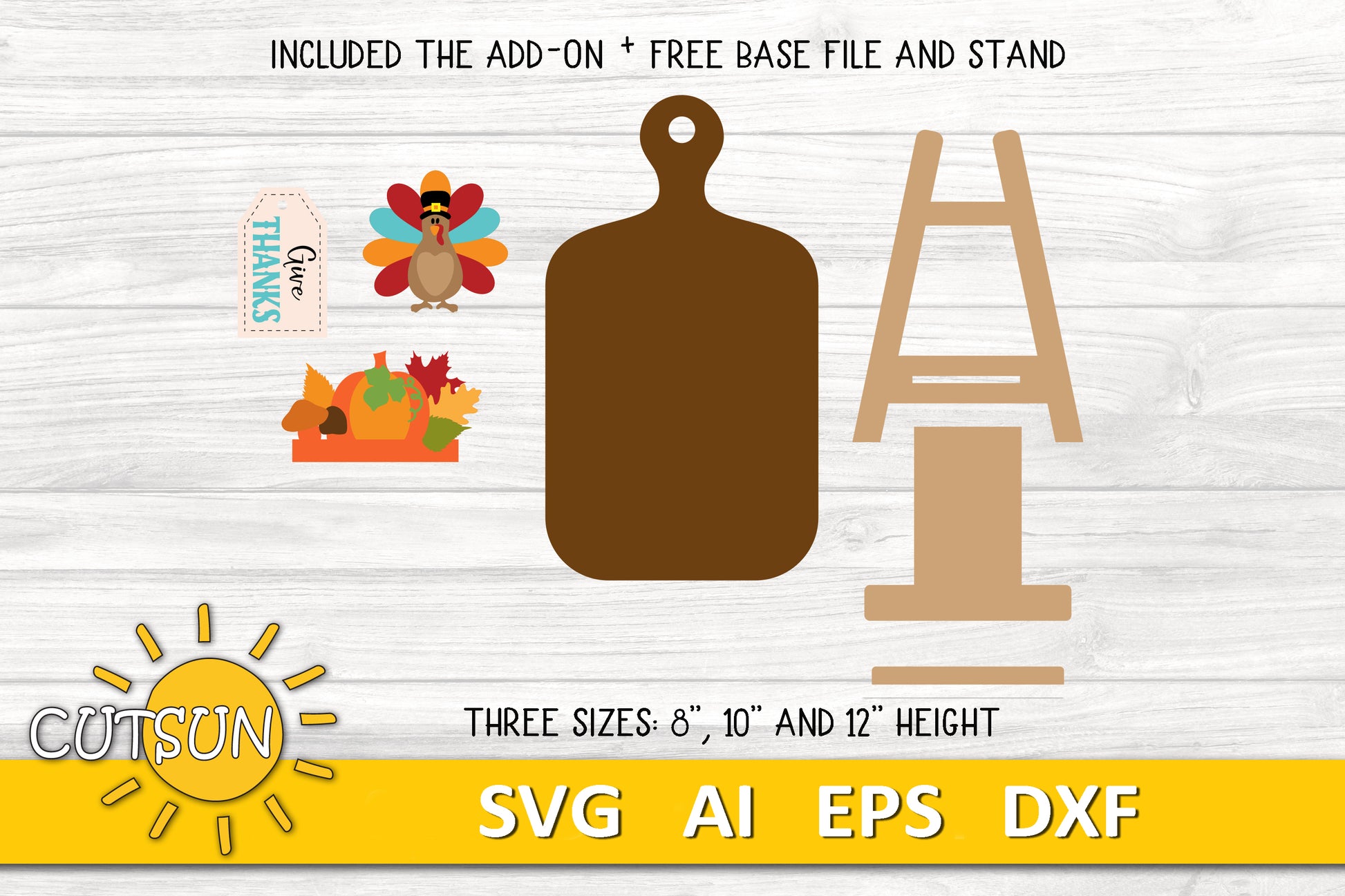 The faux cutting board and the stand are included in the cut files set and are FREE OF CHARGE. You can use them with the other add-ons for the same decor - just make sure that you cut the add-ons for the cutting board's size that you have, so they could fit it. You will also need to use material with the same thickness. The cutting board and the add-ons come in three sizes: 8", 10" and 12" height.