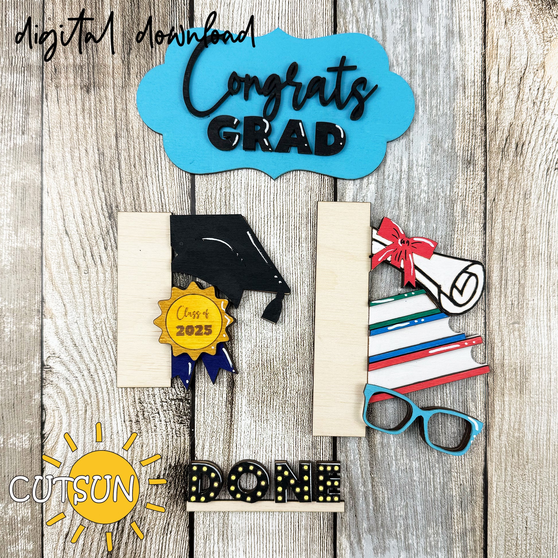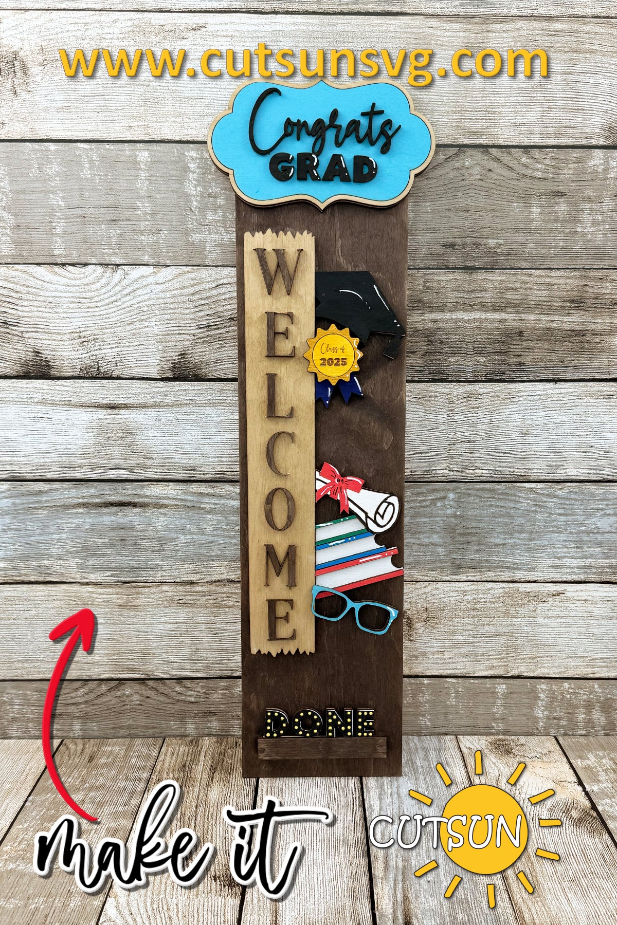 Celebrate your graduate’s big moment with this digital SVG file for an interchangeable vertical porch sign. The “Congrats Grad” add-on includes festive layered elements like a graduation cap, diploma, book stack, medallion, glasses, and bold “DONE” lettering in marquee-style – ideal for porch displays, graduation parties, or heartfelt handmade gifts.