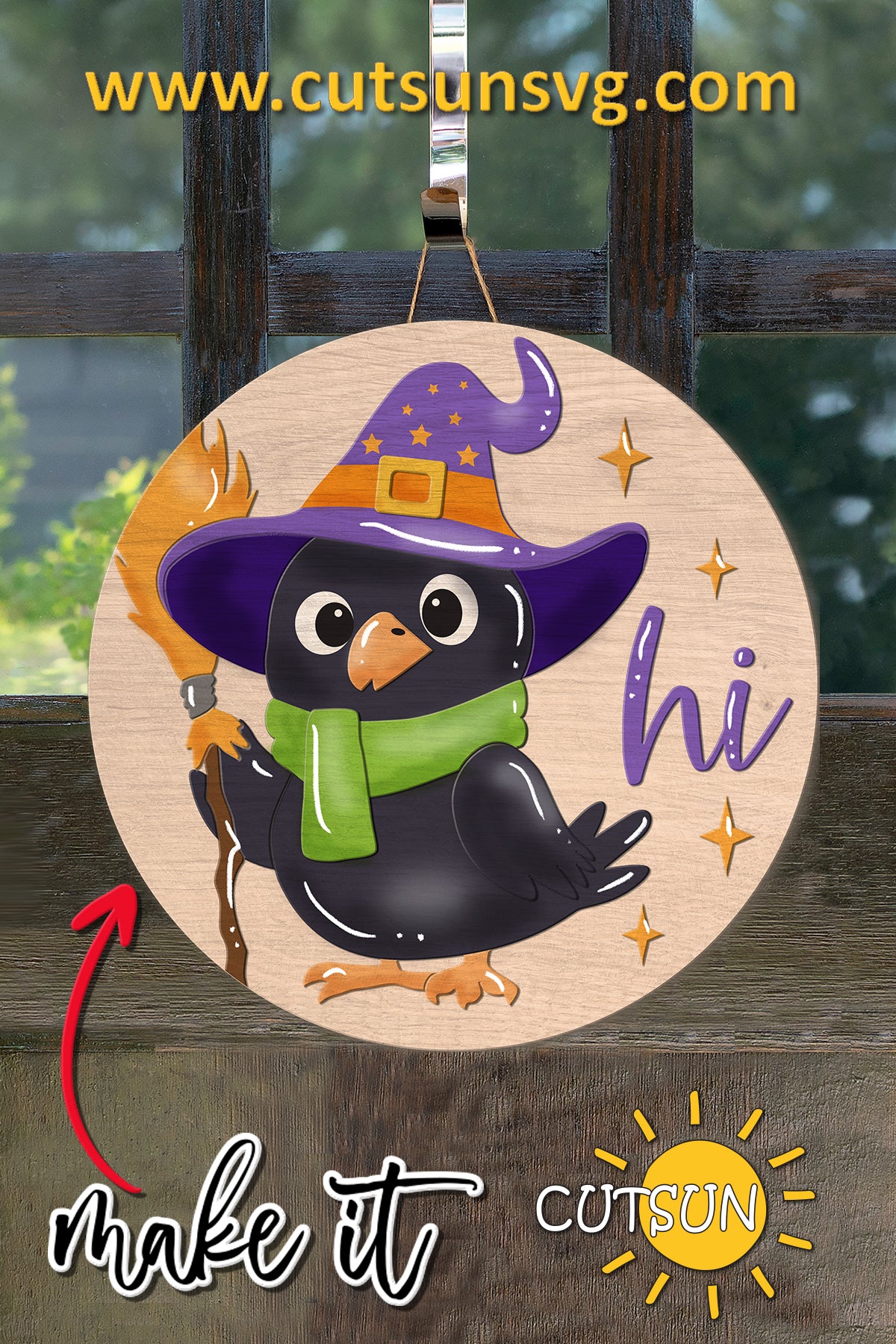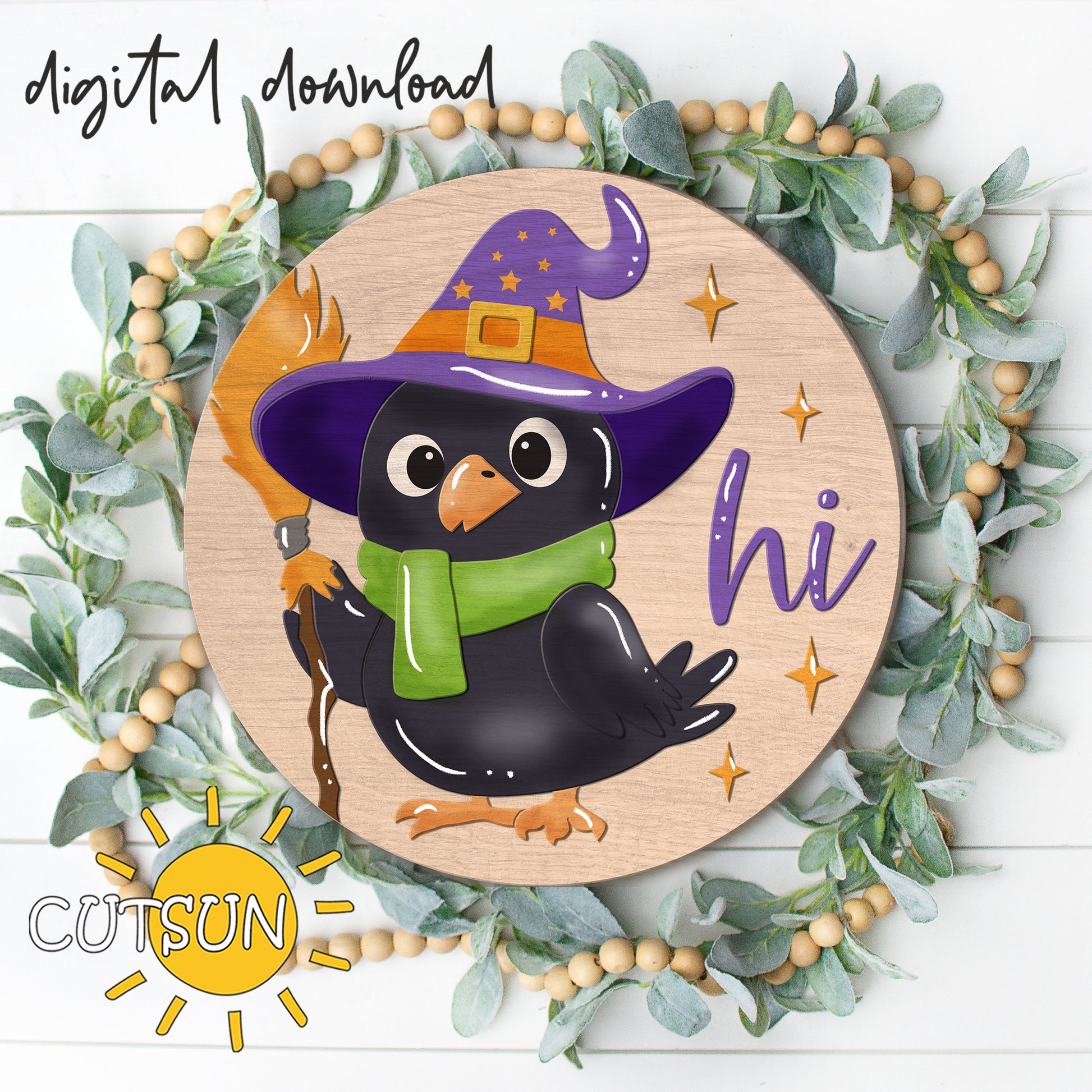 Add a touch of spooky charm to your seasonal décor with this Halloween Crow Round Sign SVG. Featuring an adorable black crow dressed as a witch, holding a broom, and greeting with a friendly “hi,” this layered laser cut file is perfect for creating festive door hangers, porch signs, or wall art.