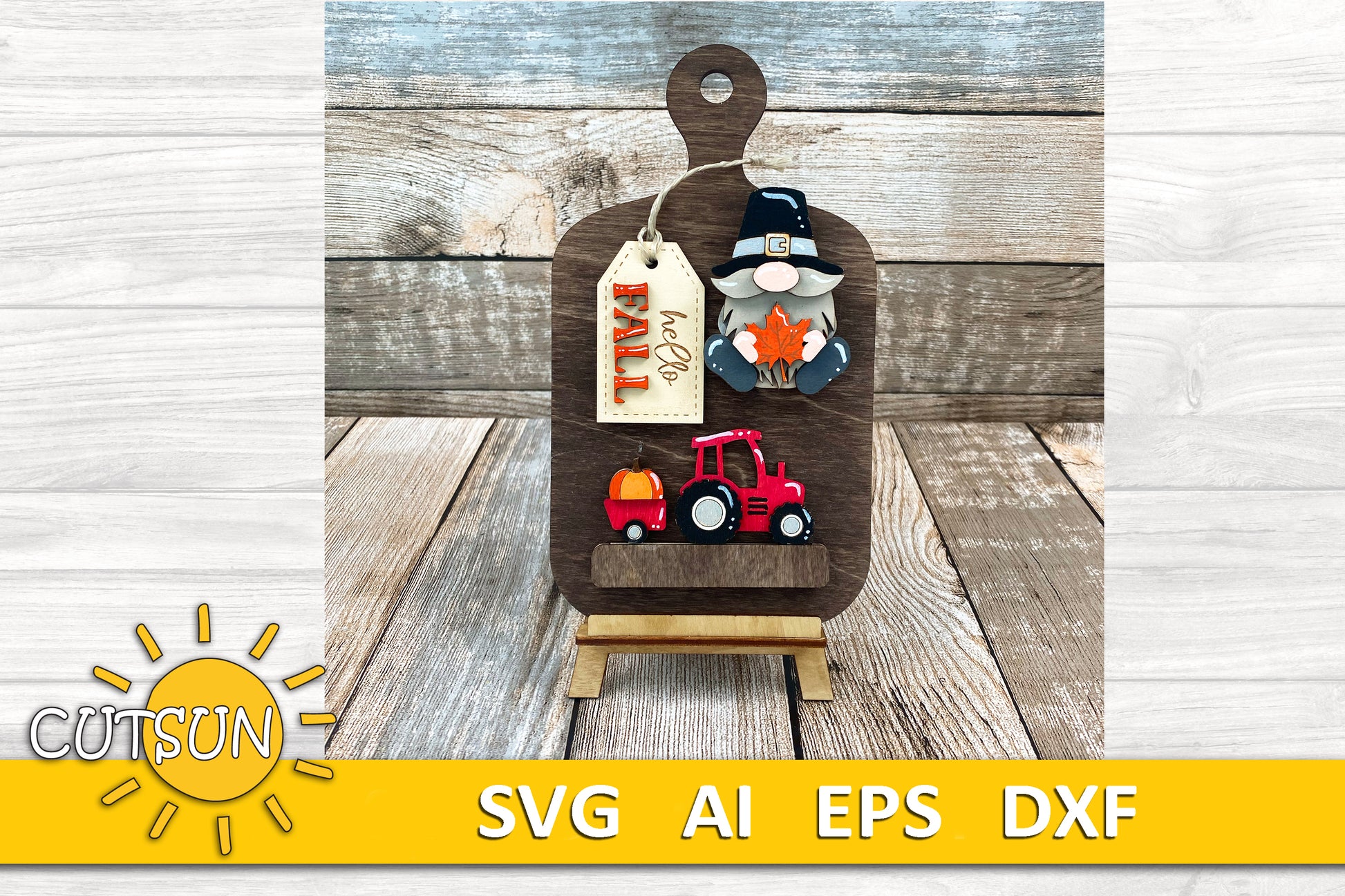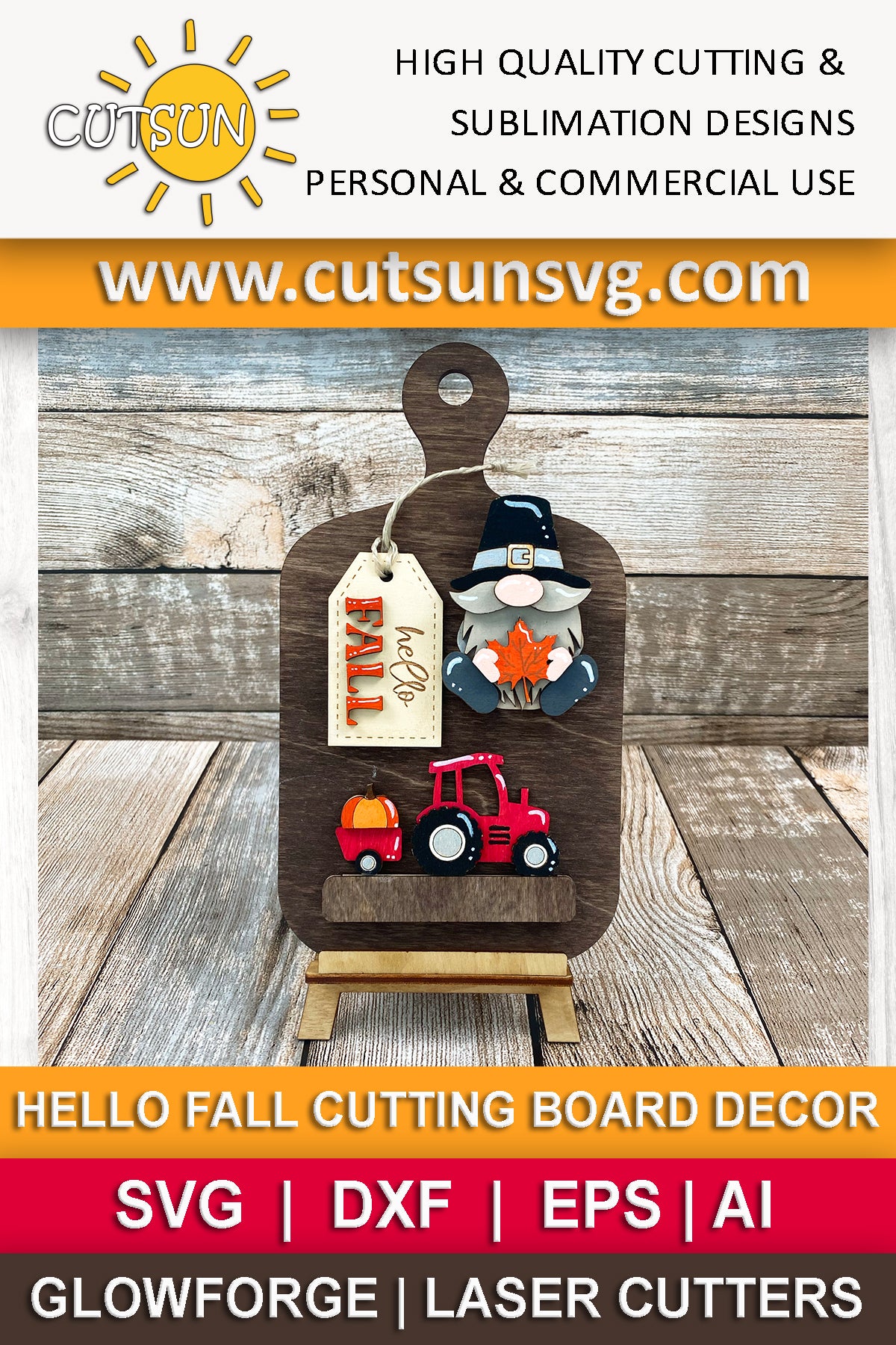 Introducing our digital download for an interchangeable Cutting board decor with a Hello Fall add-on. The laser cut file features an adorable pilgrim gnome holding a maple leaf, a tractor and a pumpkin and a tag with the words Hello Fall. The SVG is suitable for use with Glowforge, Muse, Xtool and other laser cutters.
