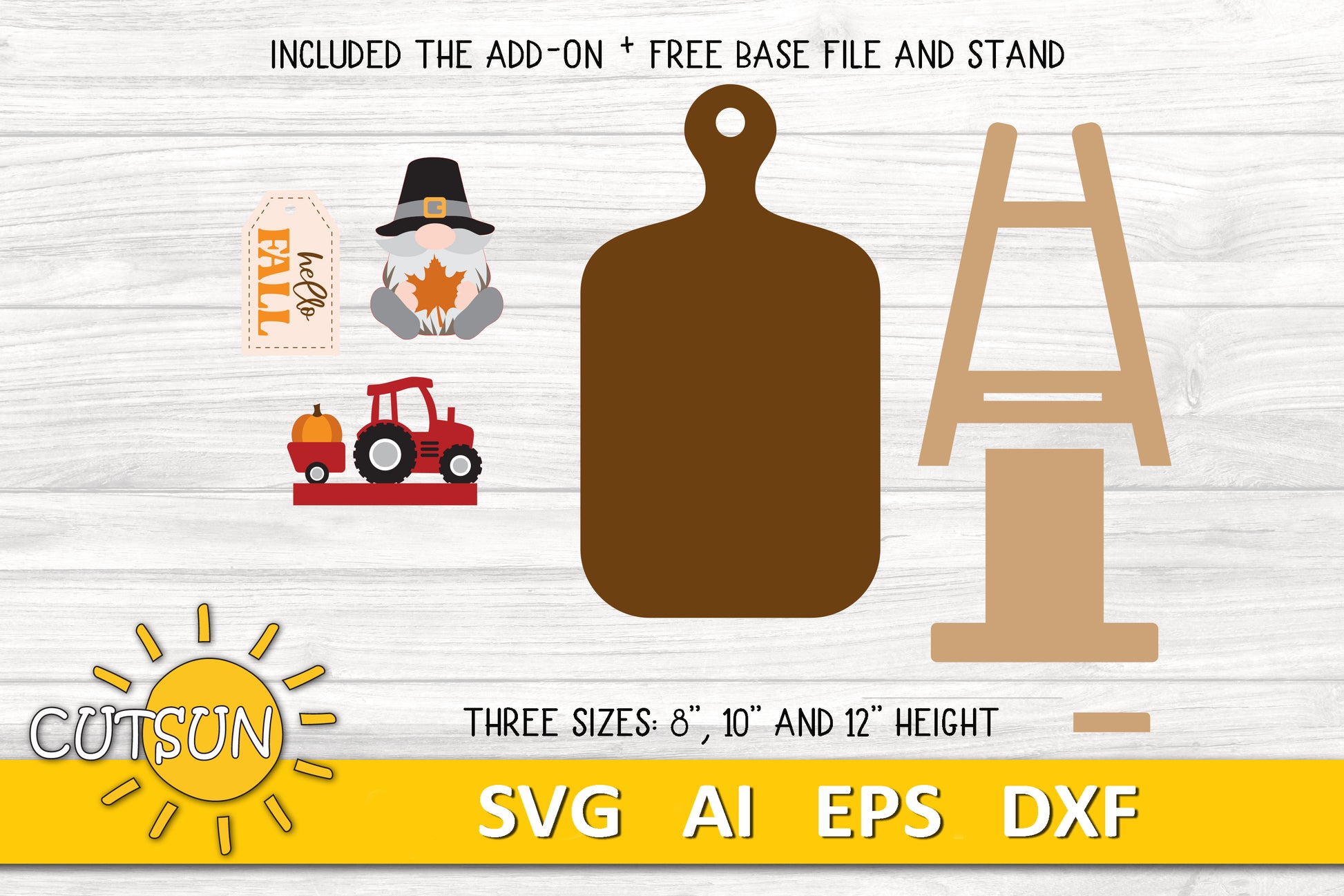 The faux cutting board and the stand are included in the cut files set and are FREE OF CHARGE. You can use them with the other add-ons for the same decor - just make sure that you cut the add-ons for the cutting board's size that you have, so they could fit it. You will also need to use material with the same thickness. The cutting board and the add-ons come in three sizes: 8", 10" and 12" height.