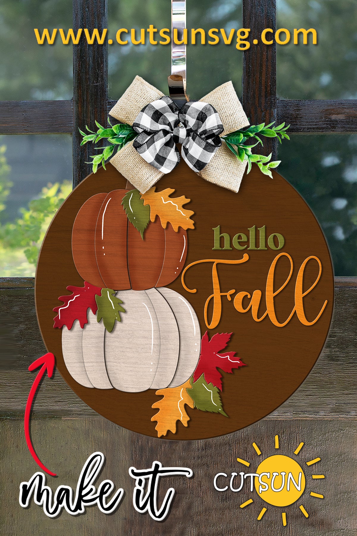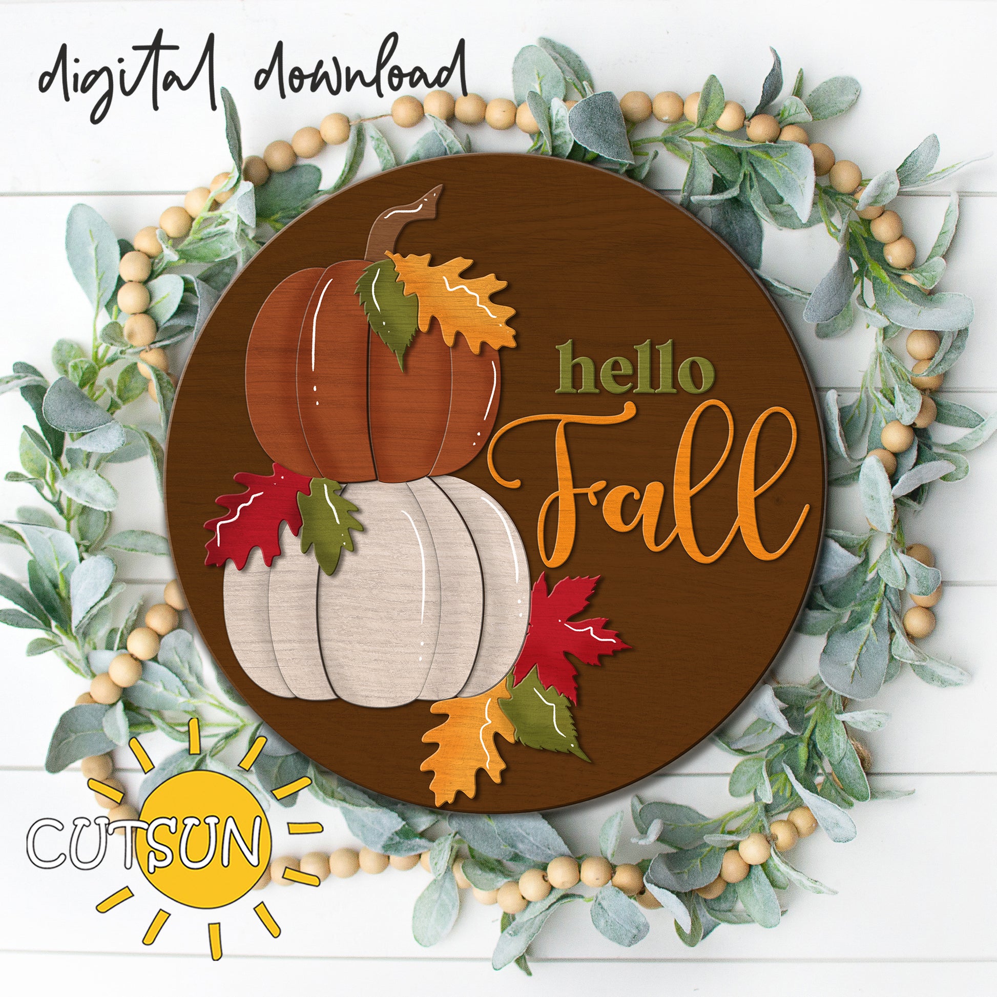 Hello Fall Round Sign SVG | Pumpkin Door Hanger SVG | Autumn Leaves Laser Cut File