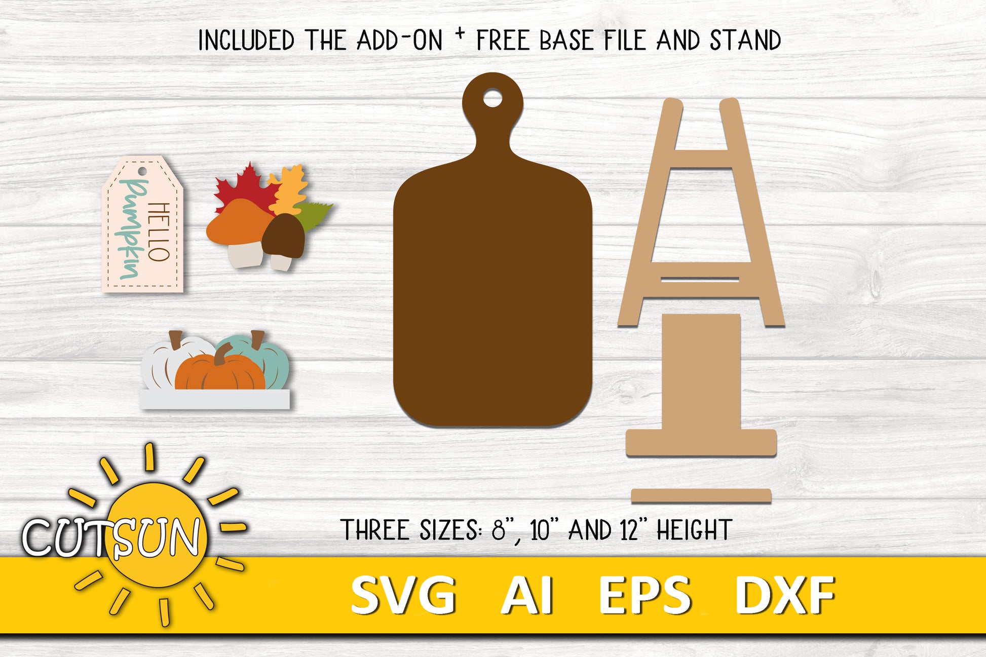 The faux cutting board and the stand are included in the cut files set and are FREE OF CHARGE. You can use them with the other add-ons for the same decor - just make sure that you cut the add-ons for the cutting board's size that you have, so they could fit it. You will also need to use material with the same thickness. The cutting board and the add-ons come in three sizes: 8", 10" and 12" height.