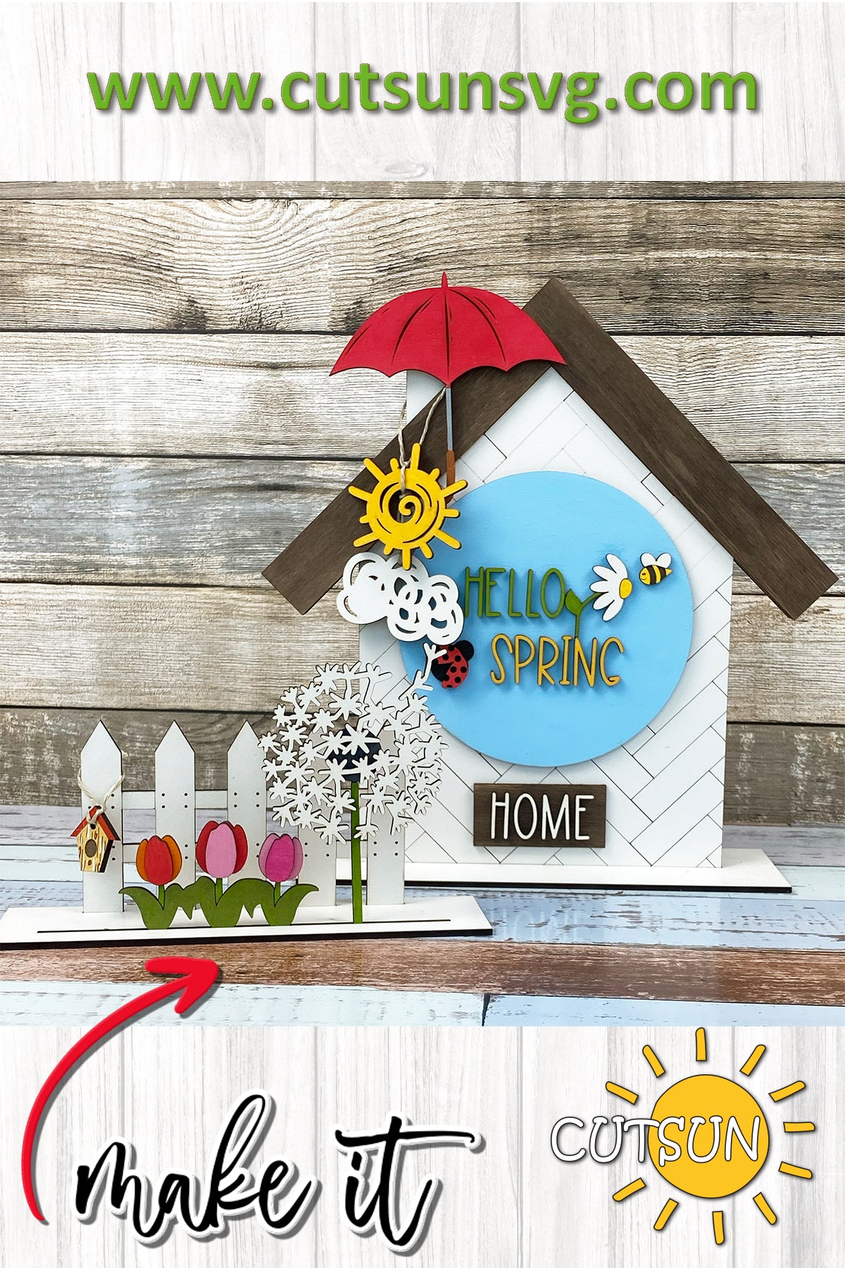 Say hello to spring with our new Hello Spring SVG add-on for the Interchangeable House and Fence shelf set! This digital download includes a laser cut file featuring a daisy, bee, and ladybug, along with the words 'Hello Spring'. You'll also get a chimney umbrella, a hanging decoration with a sunny doodle, a tiny bird house for the fence, and tulips and dandelions for the stand.