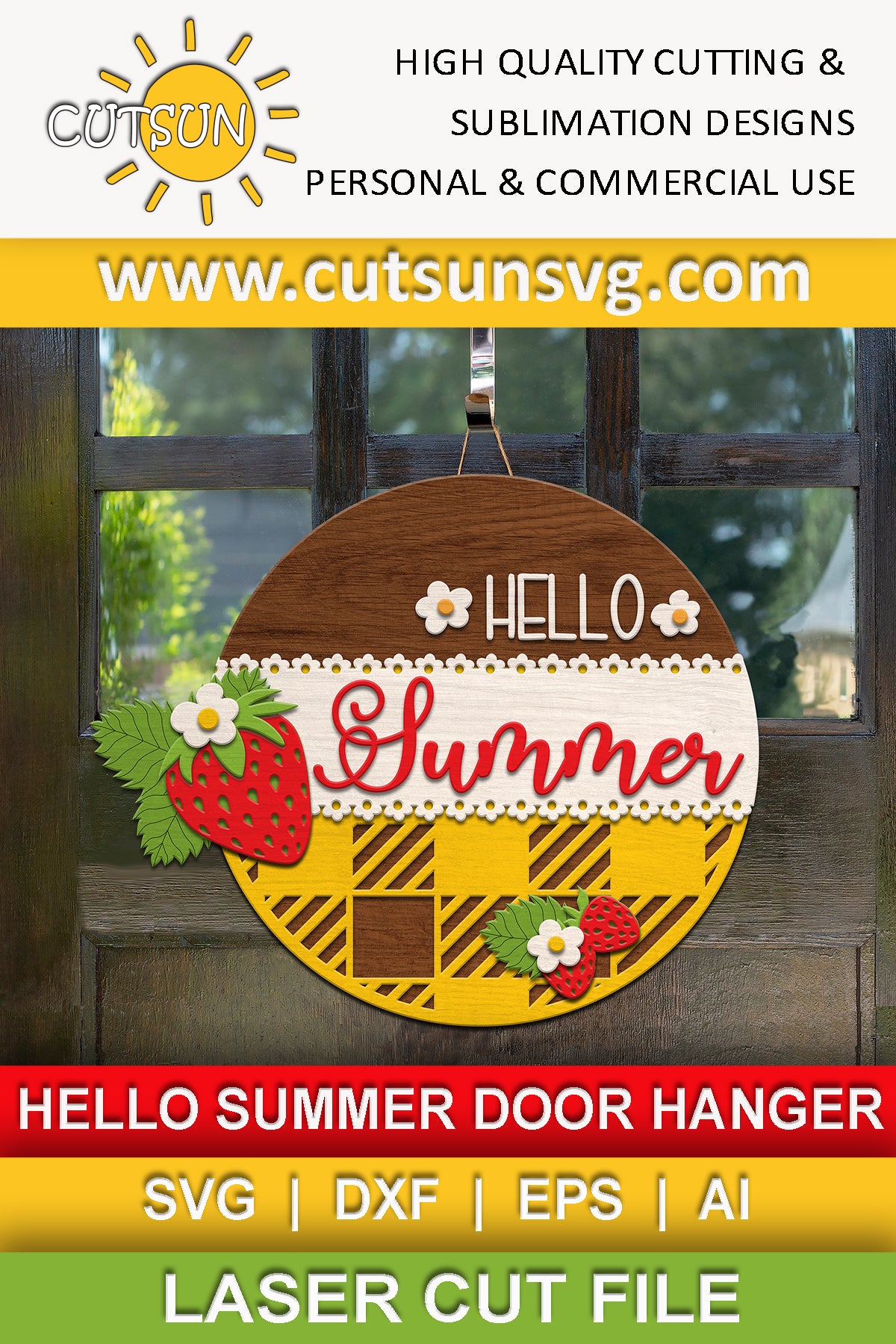 Hello Summer Door Hanger SVG | Strawberries and Buffalo Plaid Welcome Sign | Laser Cut File for Seasonal Decor