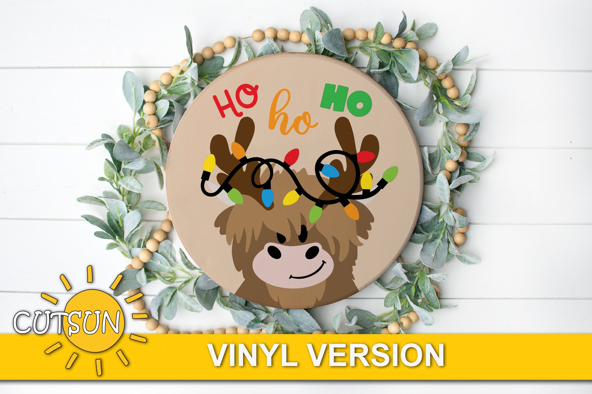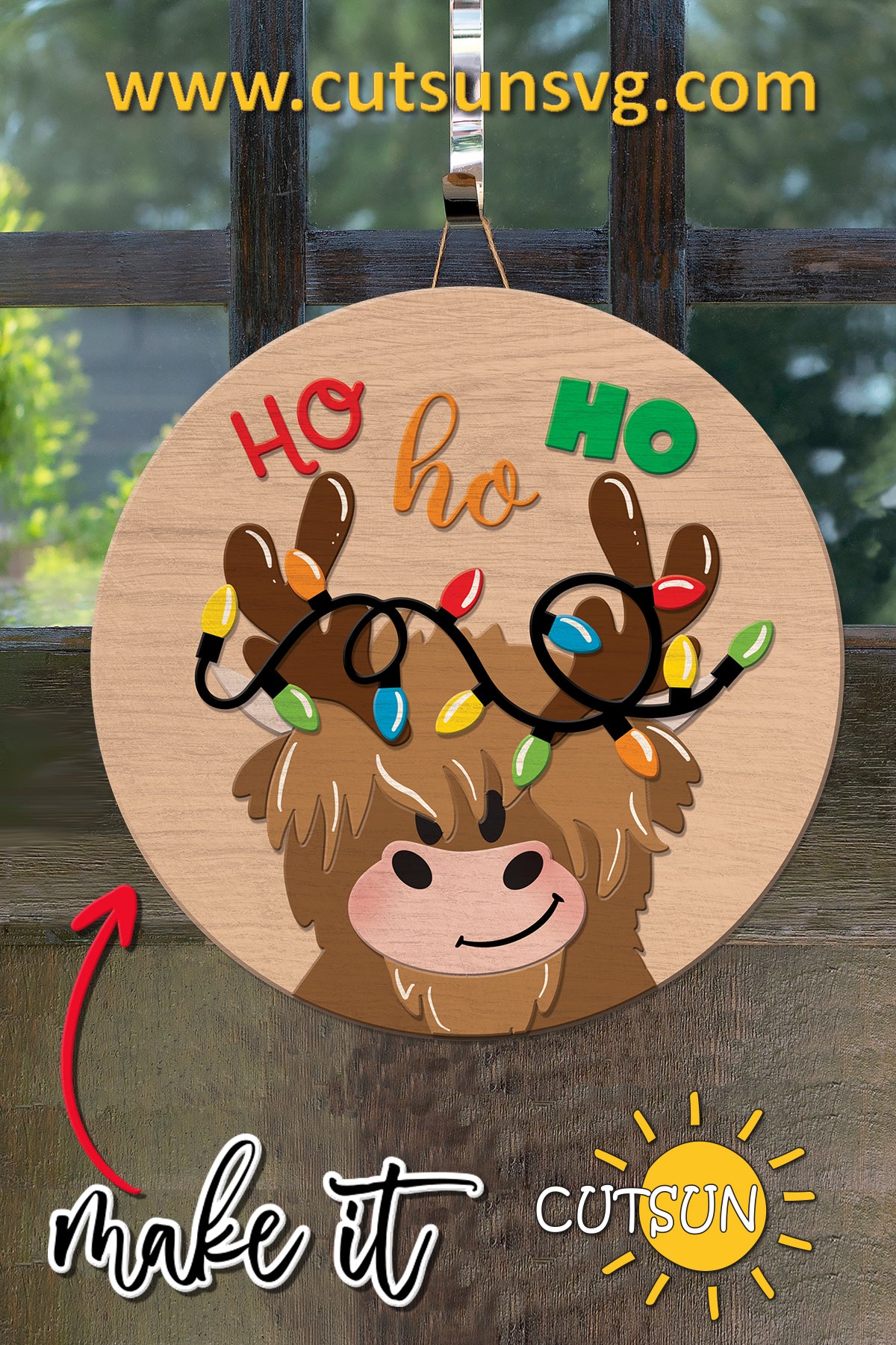 • Highland cow door hanger design with “Ho Ho Ho” text