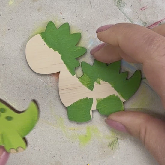 The design features a cheerful green dino in front of a volcano and grass details, built in tidy layers for a clean 3D look.