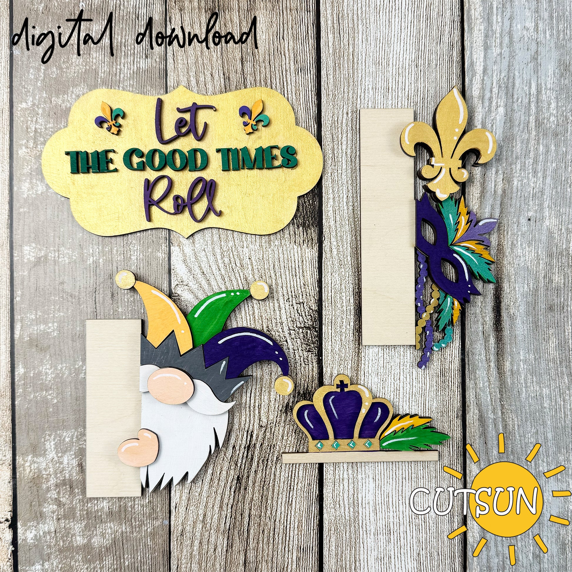 Mardi Gras Porch Sign SVG with Gnome | Interchangeable Vertical Leaner Add-On | Let the Good Times Roll Laser Cut File