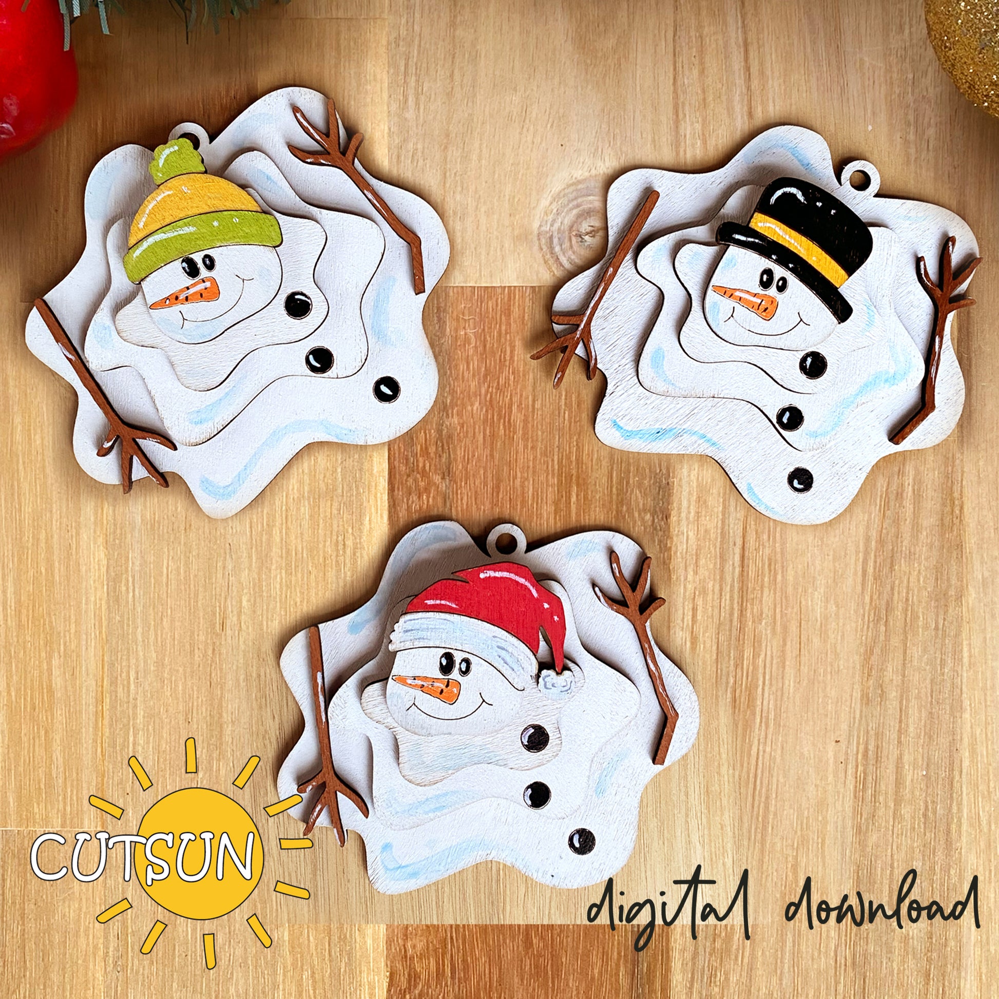 Enjoy these adorable melted snowmen designs, perfect for decorating your Christmas tree or wrapping holiday gifts. You'll receive 3 versions of the file: with 4 layers (base, head, hands), 2 layers (score+head+hands), and 1 layer (score+paint). The files, each 4" wide, make customizing easy and fun! See the preview images for more info.