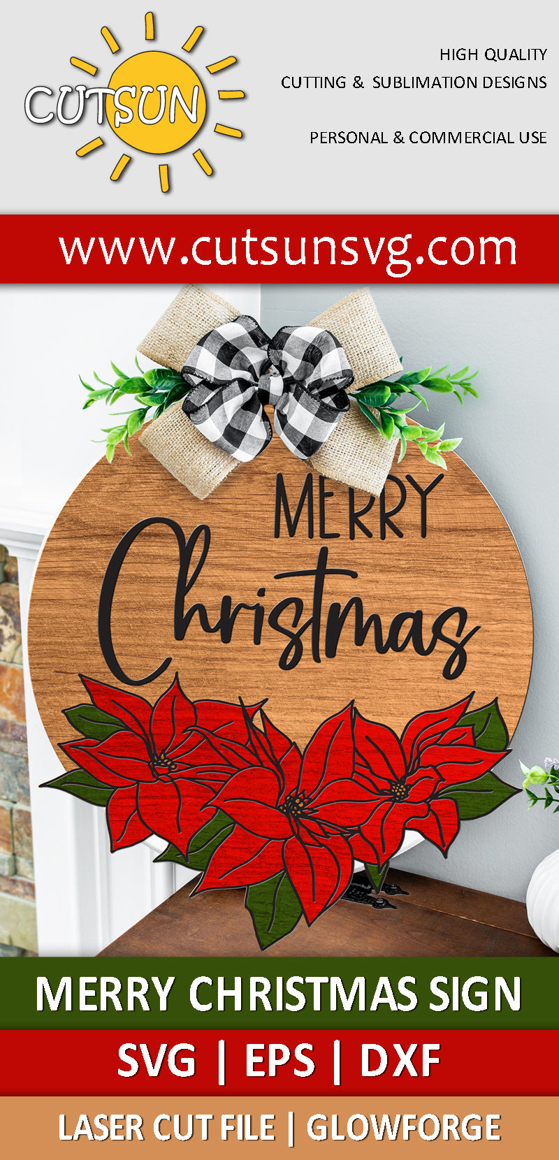 Merry Christmas Round Sign SVG | Christmas Door Welcome Sign with Poinsettia bouquet