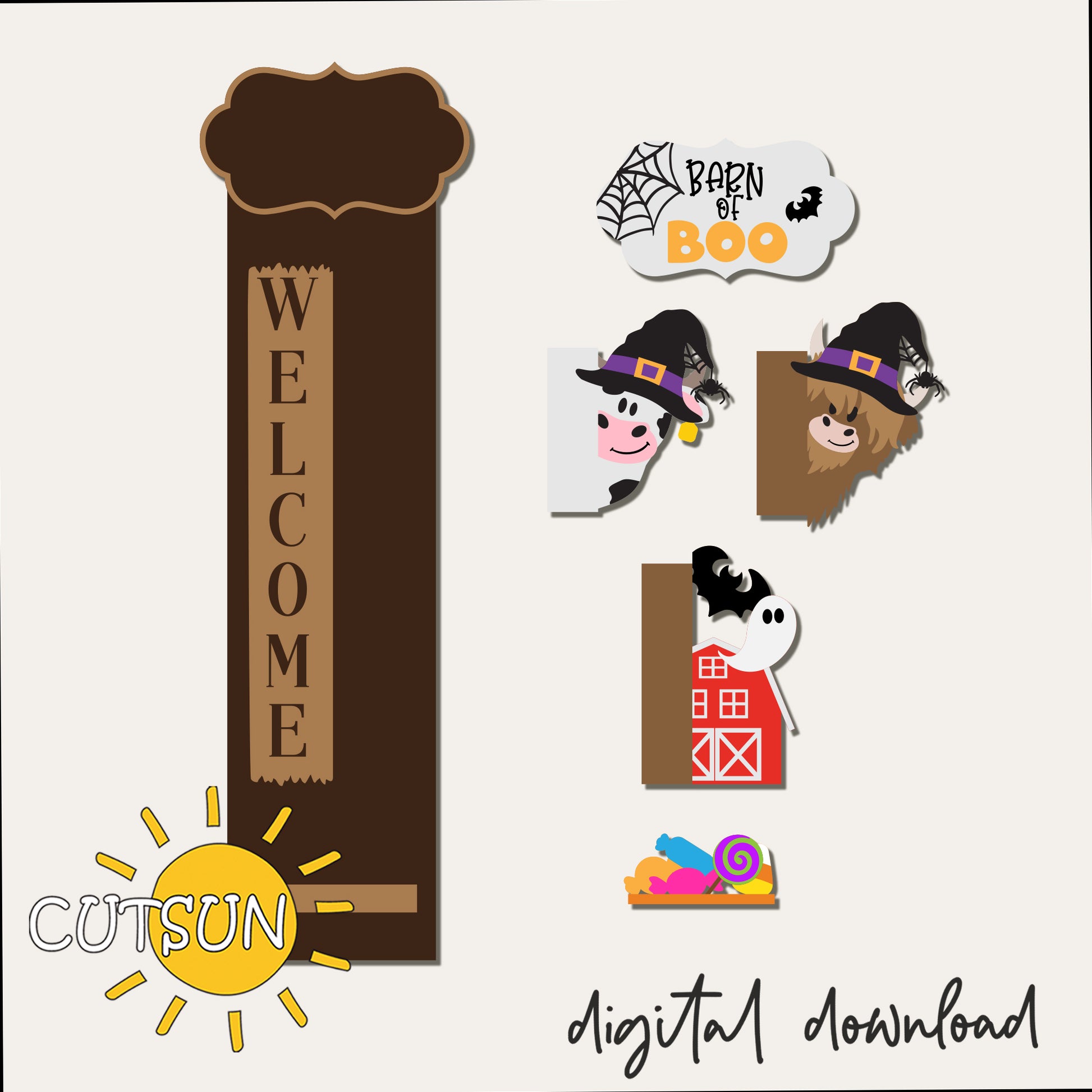 Bring spooky farmhouse fun to your entryway with this Barn of Boo Halloween add-on for interchangeable vertical porch leaners and shelf sitters. This digital download includes layered laser cut files featuring a festive top plaque reading Barn of Boo, two character options (friendly witch or Bigfoot in a witch hat), a red barn with a ghost accent, bats, candy clusters, and the WELCOME base to complete the look. Designed to add playful Halloween charm to porches, doors and shelves, this set transforms your vertical leaner into a unique seasonal statement piece.
