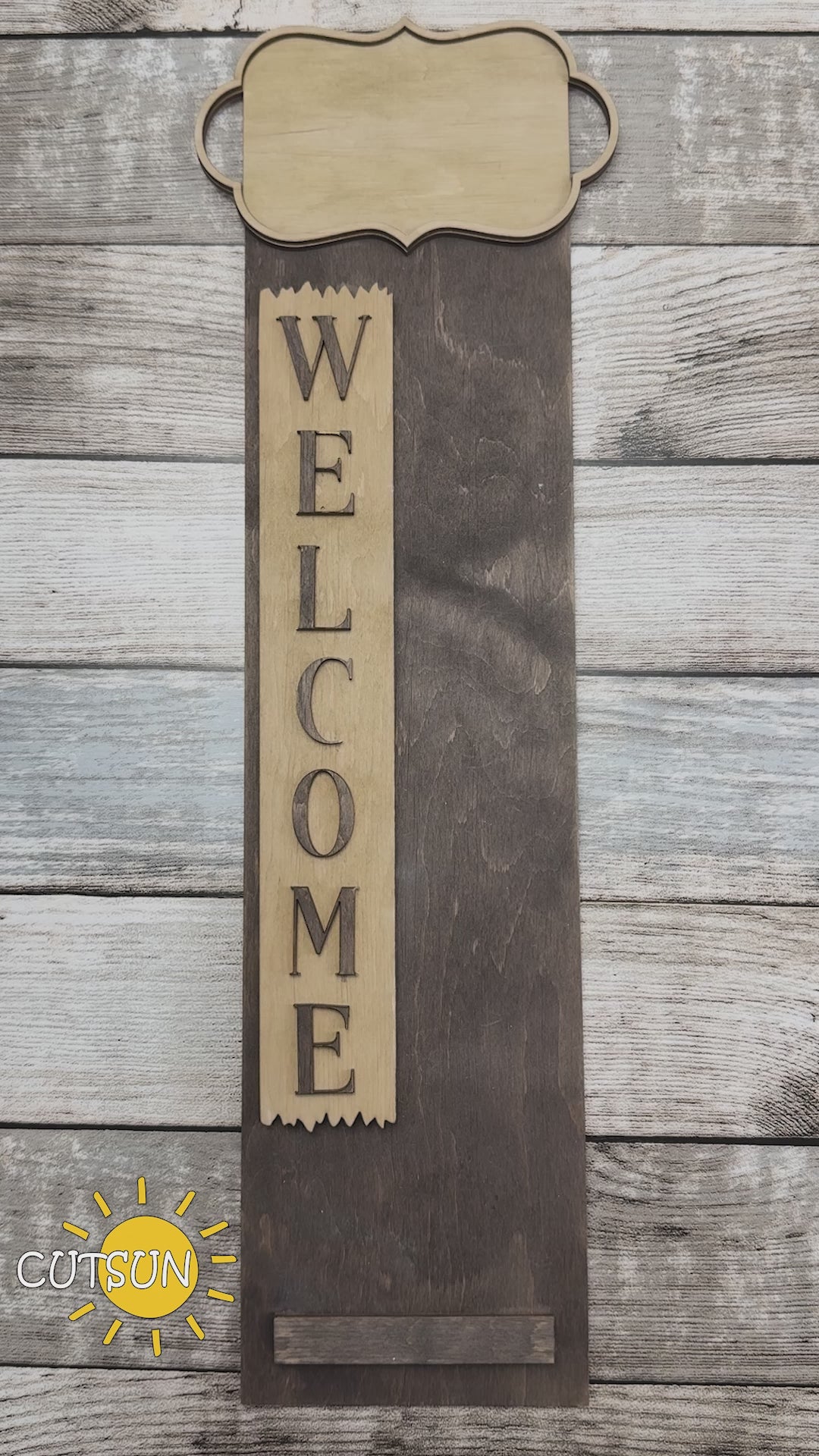 Your download also includes the main vertical WELCOME leaner base free of charge. The layout is sized for 12 x 49.5 inches and also fits 12 x 48 inch pre-cut blanks without adjustment. All elements are designed with a consistent material thickness for smooth assembly. Resizing has been tested down to about 19 inches tall without losing detail. File formats provided are SVG, AI, DXF and EPS for seamless use in most laser software.