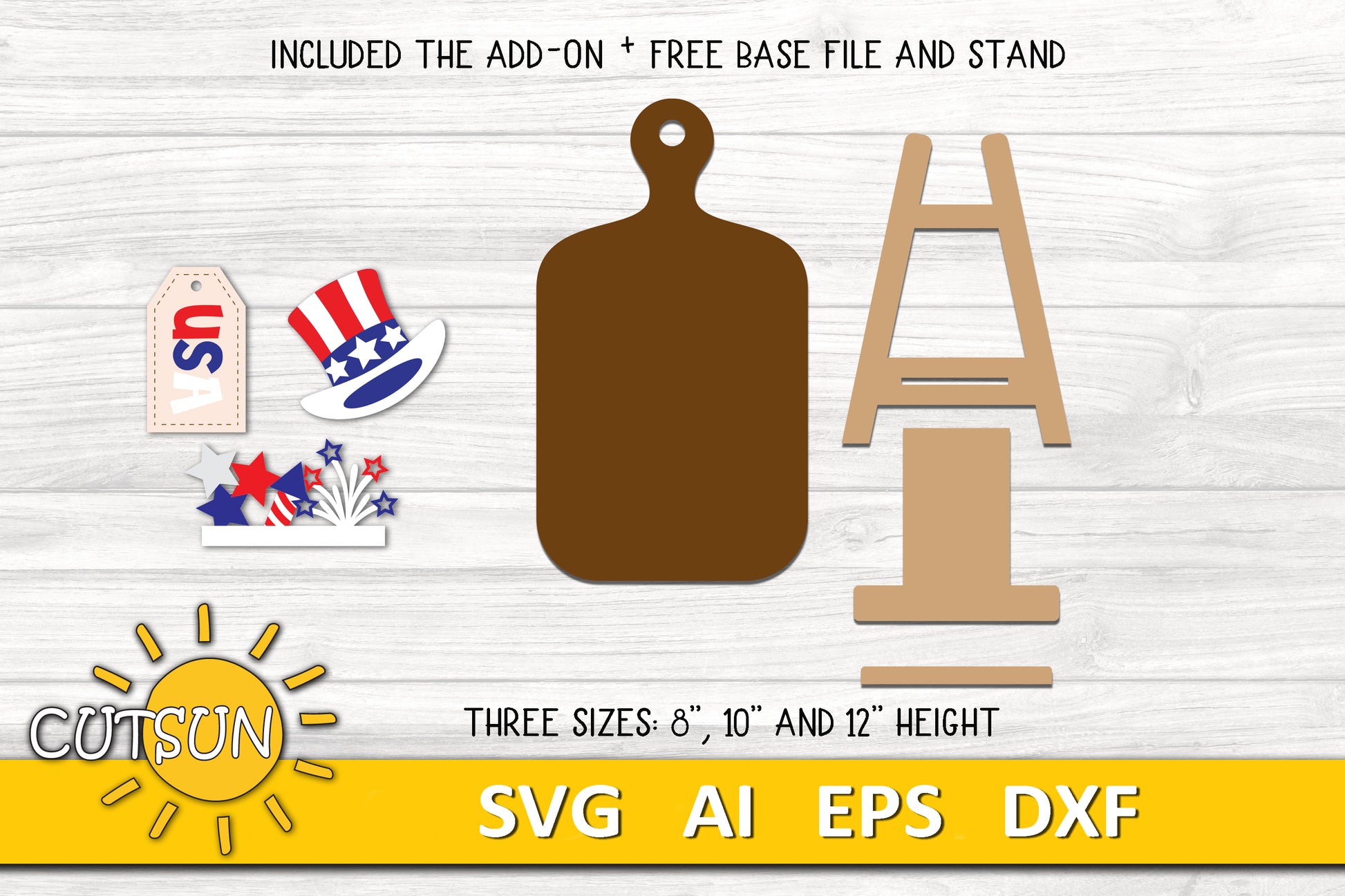 The faux cutting board and the stand are included in the cut files set and are FREE OF CHARGE. You can use them with the other add-ons for the same decor - just make sure that you cut the add-ons for the cutting board's size that you have, so they could fit it. You will also need to use material with the same thickness. The cutting board and the add-ons come in three sizes: 8", 10" and 12" height.