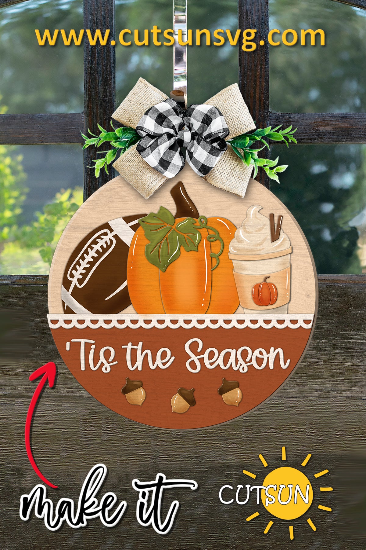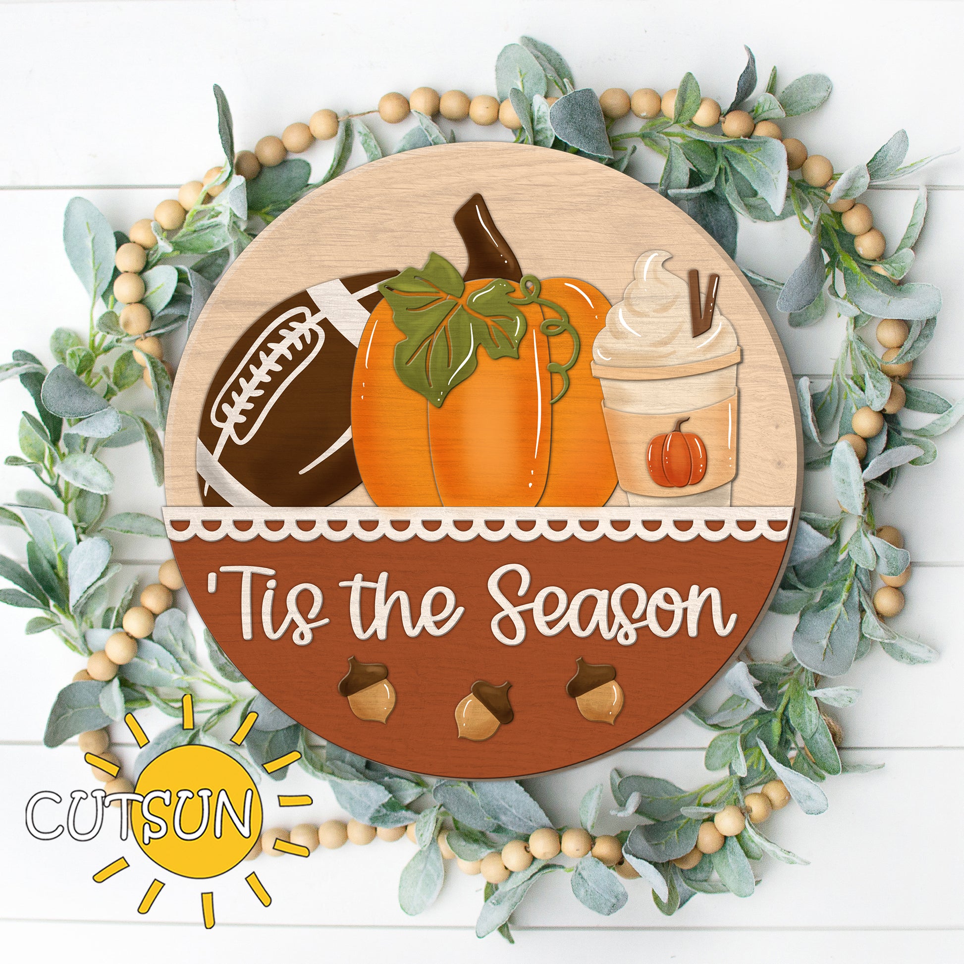 Tis the Season Round Sign SVG | Football Pumpkin Latte Door Hanger | Fall Laser Cut Files for Glowforge