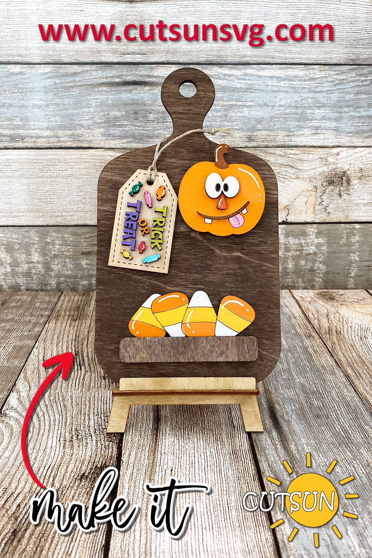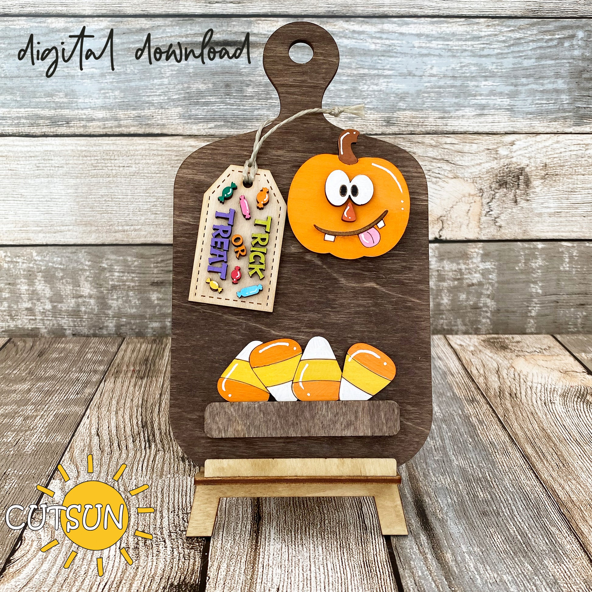 Introducing our digital download for an interchangeable Cutting board decor with a whimsical Jack O Lantern add-on. The laser cut file features a cute pumpkin, candy corns, and a tag with the words Trick or treat and candies. The SVG is suitable for use with Glowforge, Muse, Xtool and other laser cutters.