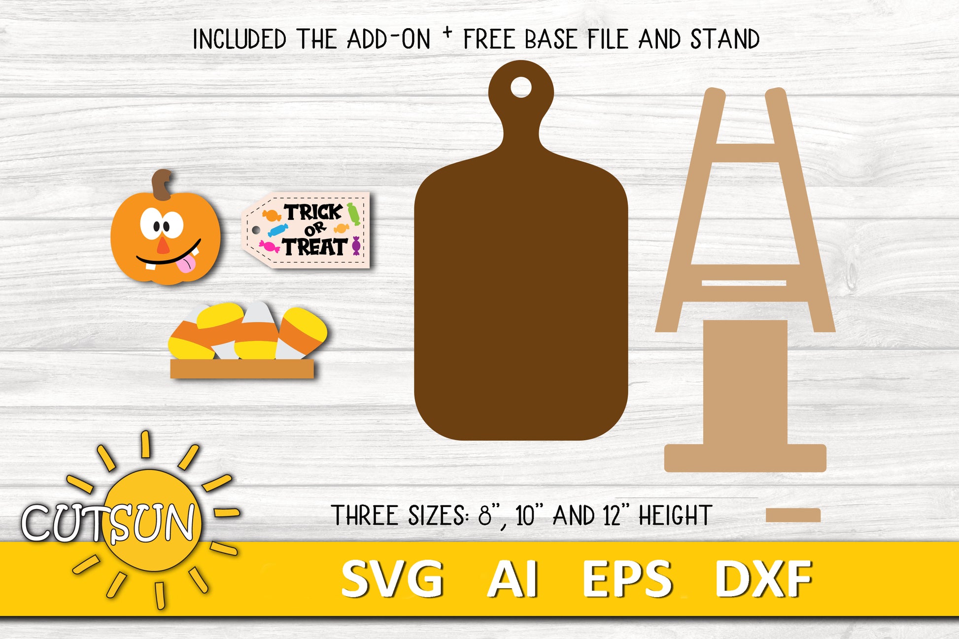 The faux cutting board and the stand are included in the cut files set and are FREE OF CHARGE. You can use them with the other add-ons for the same decor - just make sure that you cut the add-ons for the cutting board's size that you have, so they could fit it. You will also need to use material with the same thickness. The cutting board and the add-ons come in three sizes: 8", 10" and 12" height.