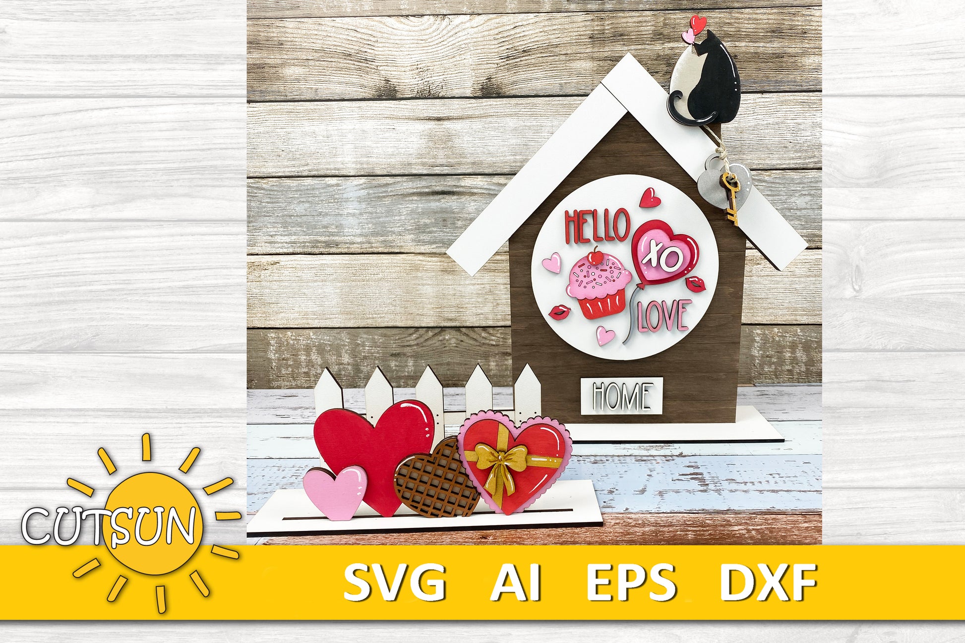 Celebrate Valentine's day with our joyful Interchangeable House and Fence shelf decor SVG add-on! This digital download includes a heart-shaped balloon, a cupcake, hearts and lips, and the phrase 'Hello Love'. The laser cut file also features two cuddling cats with hearts for the chimney, a hanging heart-shaped lock and key, and unique heart designs for the stand and fence.
