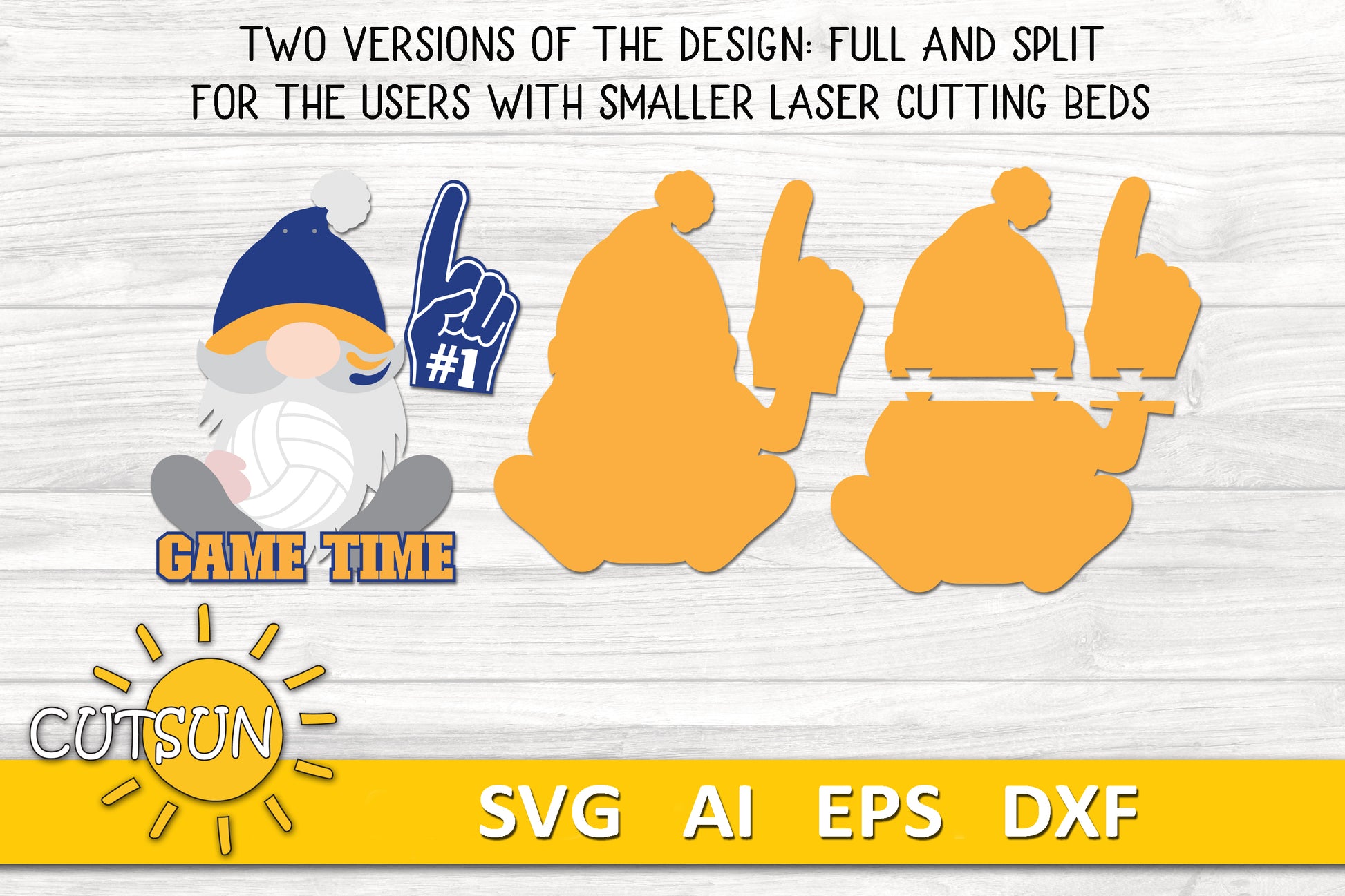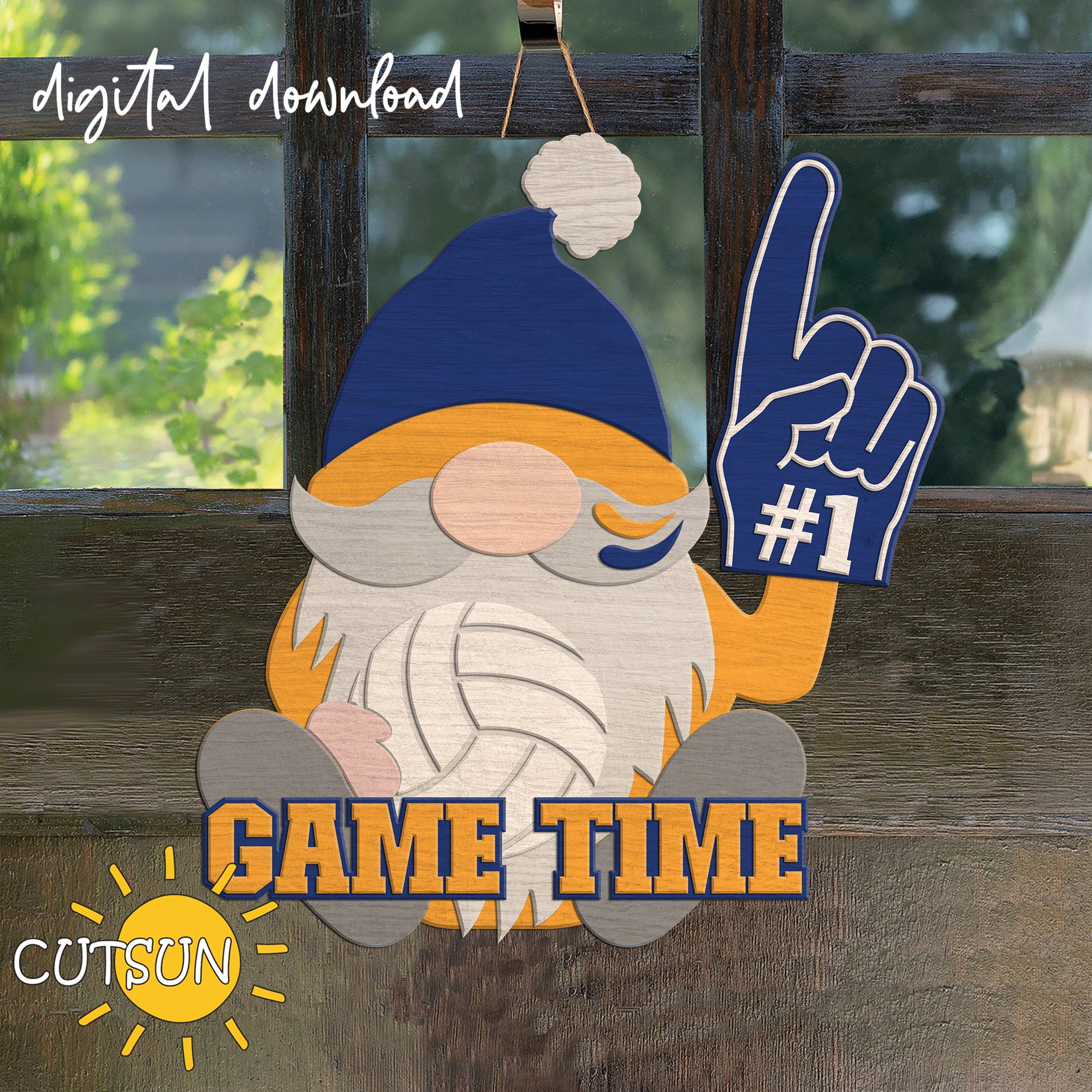 Cute Volleyball themed door hanger - a Gnome holding a voleyball and a foam hand. The file can be used with Glowforge | Laser cutters and with Cricut / Silhouette craft cutting machines.