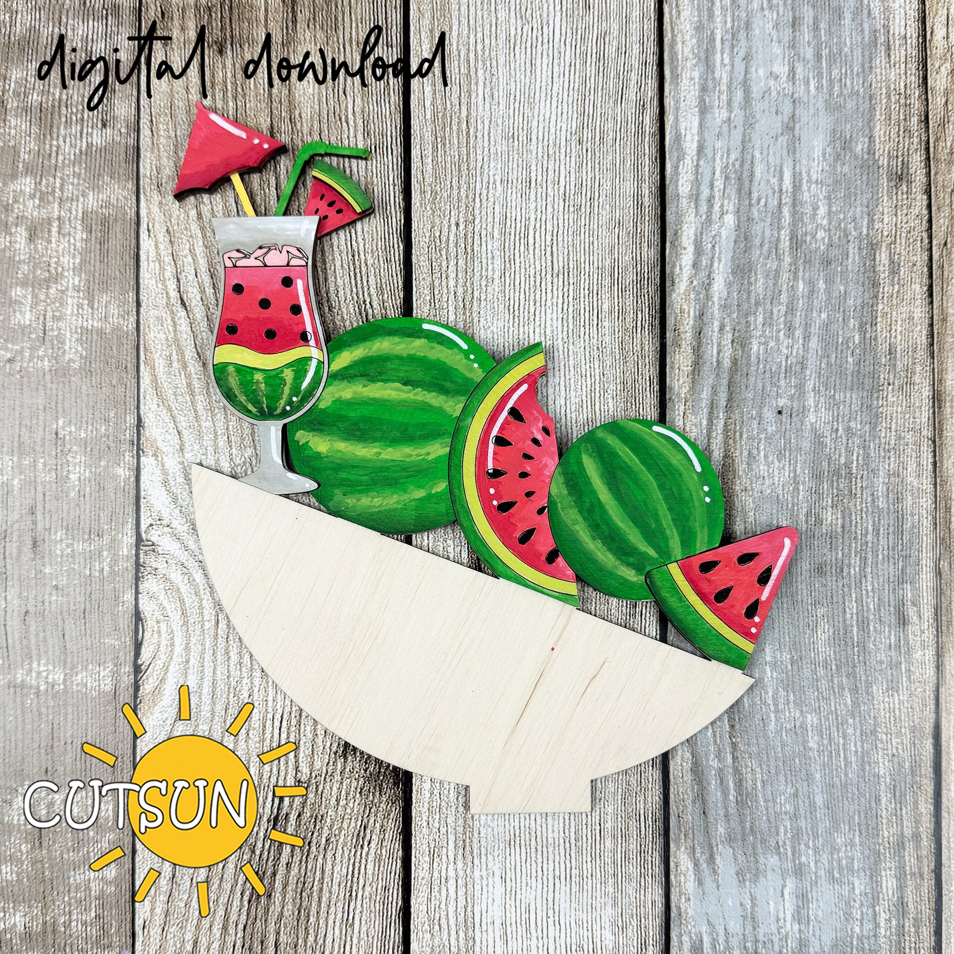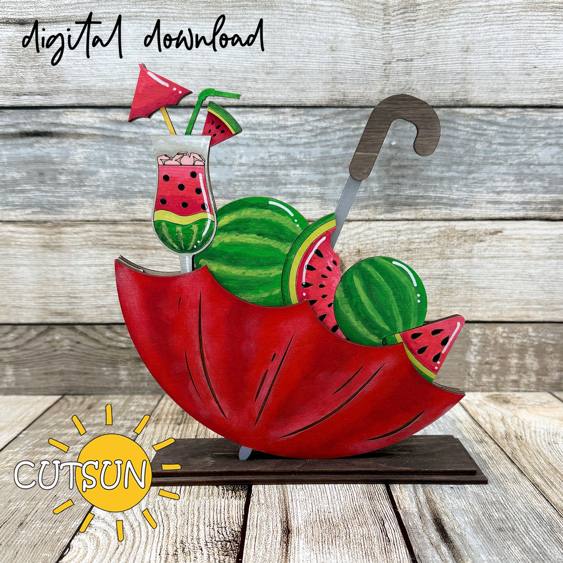 🍉 Bring summer sweetness to your decor with this watermelon-themed add-on for the interchangeable upside down umbrella shelf sitter! Featuring juicy watermelon slices, leafy details, and a fruity cocktail topped with a mini umbrella, this design is bursting with bright, sunny vibes.